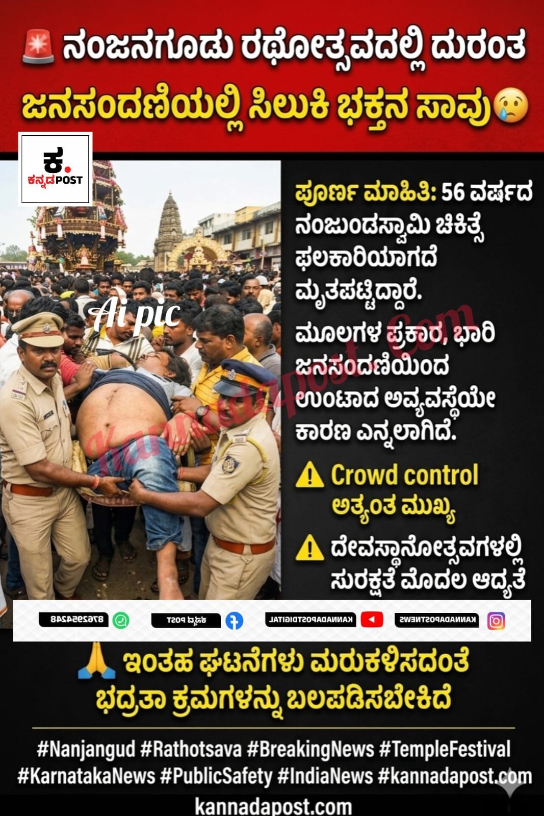 📍 ನಂಜನಗೂಡು,ಮಾರ್ಚ್,30,2026(www.kannadapost.com): ಪ್ರಸಿದ್ಧ ರಥೋತ್ಸವದ ವೇಳೆ ದುರಂತ ಸಂಭವಿಸಿದ್ದು, ಜನಸಂದಣಿಯಲ್ಲಿ ಸಿಲುಕಿ ಭಕ್ತನೊಬ್ಬ ಸಾವನ್ನಪ್ಪಿರುವ ಘಟನೆ ನಡೆದಿದೆ.
