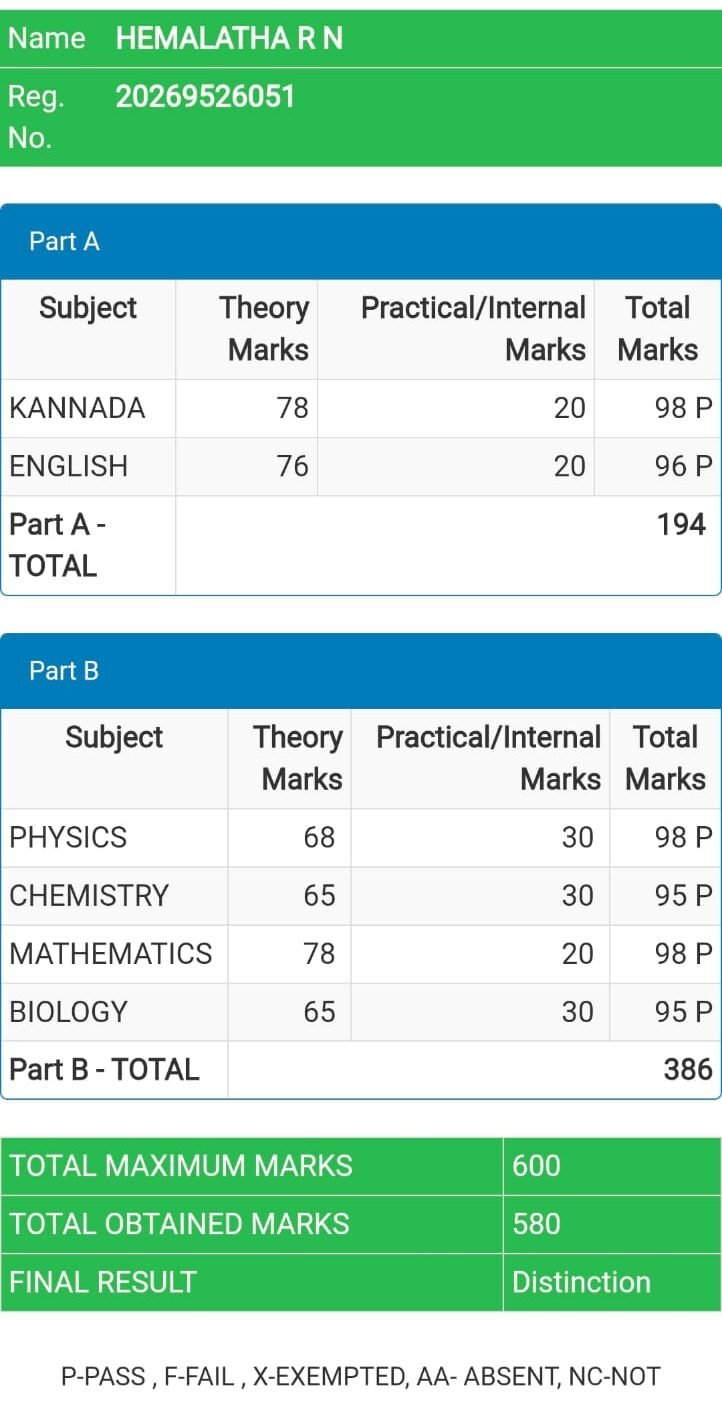 Hemalatha from Hassan scores 580/600 in 2nd PUC exams, proving that determination and hard work can overcome financial struggles.
