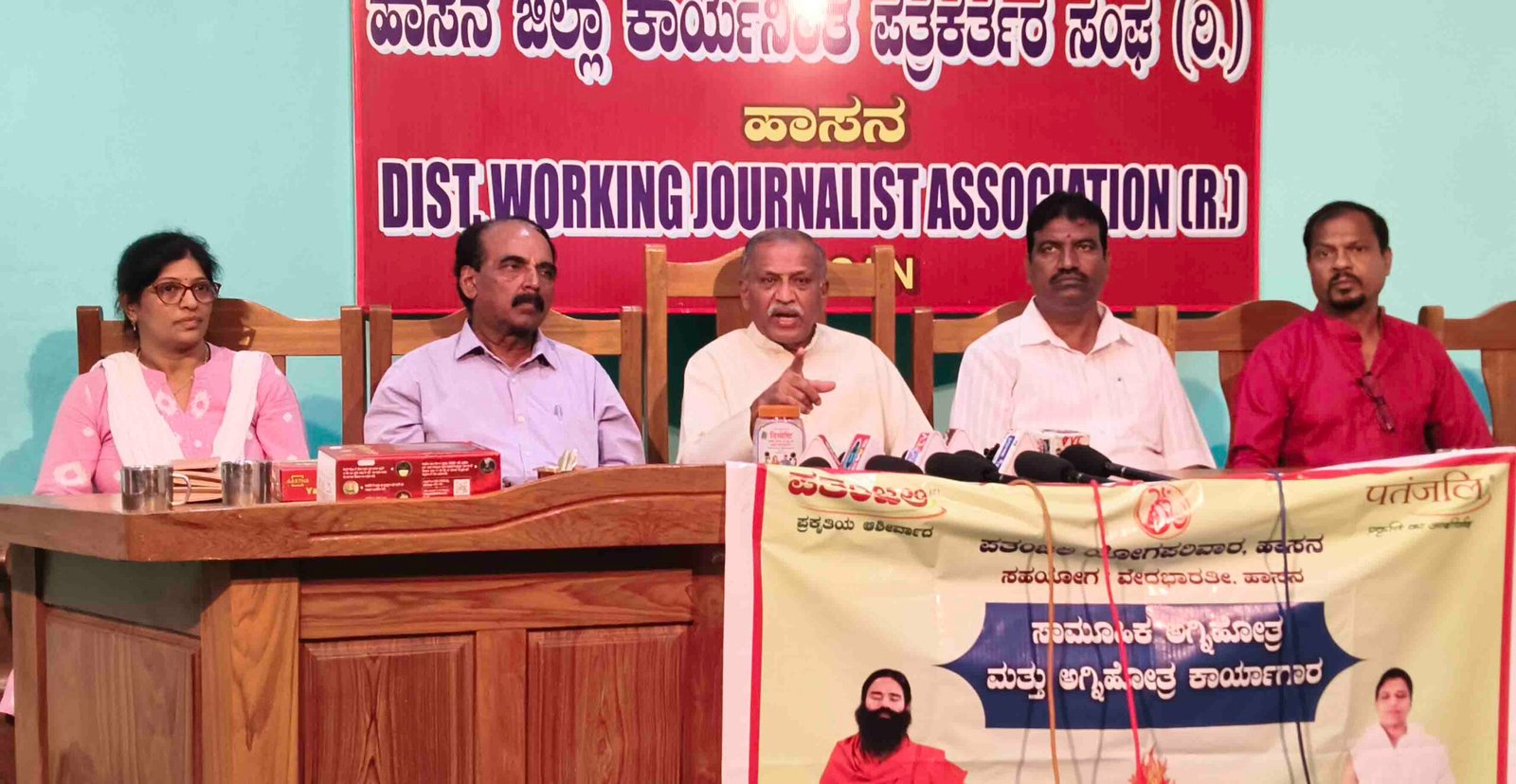 ಹಾಸನ: ನಗರದ ಹಾಸನಾಂಬೆ ದೇವಾಲಯದ ರಸ್ತೆ, ಶ್ರೀ ಕನ್ನಿಕಾ ಪರಮೇಶ್ವರಿ ದೇವಾಲಯ ಆವರಣದಲ್ಲಿ ಪತಂಜಲಿ ಯೋಗ ಸಮಿತಿ ಸಹಯೋಗ, ವೇದ ಭಾರತೀ ಹಾಗೂ ಶ್ರೀ ಕನ್ನಿಕಾ ಪರಮೇಶ್ವರಿ ದೇವಾಲಯ ಸಮಿತಿ ಸಹಯೋಗದಲ್ಲಿ ಅ.5ರ ಭಾನುವಾರದಂದು ಲೋಕ ಕಲ್ಯಾಣಕ್ಕಾಗಿ ಸಾಮೂಹಿಕ ಅಗ್ನಿಹೋತ್ರ ಮತ್ತು ಅಗ್ನಿಹೋತ್ರ ಕಾರ್ಯಾಗಾರ ಹಮ್ಮಿಕೊಳ್ಳಲಾಗಿದೆ ಎಂದು ಪತಂಜಲಿ ಯೋಗ ಪೀಠದ ರಾಜ್ಯ ಯಜ್ಞ ಪ್ರಭಾರಿ ಮತ್ತು ವೇದ ಭಾರತಿಯ ರಾಜ್ಯ ಸಂಯೋಜಕ ಹರಿಹರಪುರ ಶ್ರೀಧರ್ ತಿಳಿಸಿದರು.