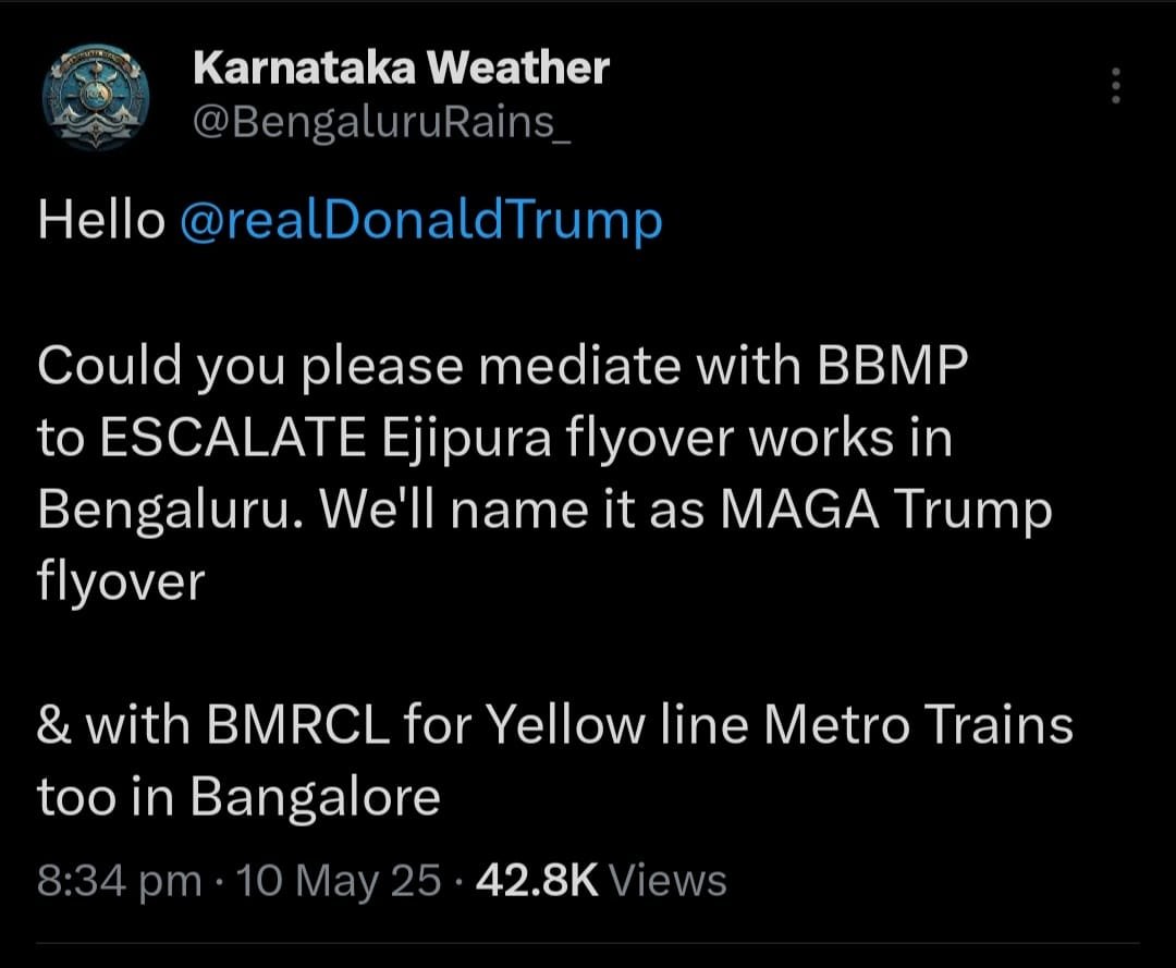 ಮೇ 10, 2025ರಂದು, @BengaluruRains_ ಎಂಬ X ಖಾತೆಯಿಂದ ಪೋಸ್ಟ್ ಮಾಡಲಾದ ಟ್ವೀಟ್ನಲ್ಲಿ, ಈಜಿಪುರ ಫ್ಲೈ ಓವರ್ ಕಾಮಗಾರಿಯನ್ನು ತ್ವರಿತಗೊಳಿಸಲು ಬೃಹತ್ ಬೆಂಗಳೂರು ಮಹಾನಗರ ಪಾಲಿಕೆ (BBMP) ಜೊತೆಗೆ ಮಧ್ಯಸ್ಥಿಕೆ ನಡೆಸುವಂತೆ ಟ್ರಂಪ್ರಿಗೆ ವಿನಂತಿಸಲಾಗಿದೆ.