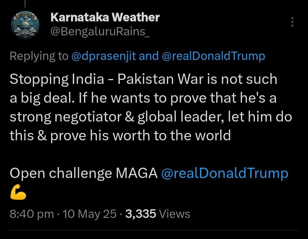 ಬೆಂಗಳೂರು, ಮೇ 12, 2025:ಭಾರತ-ಪಾಕಿಸ್ತಾನ ಗಡಿ ಉದ್ವಿಗ್ನತೆಯ ನಂತರ ಟ್ರಂಪ್ ಶಾಂತಿ ಸ್ಥಾಪನೆಗೆ ಮಧ್ಯಸ್ಥಿಕೆ ವಹಿಸಿದ್ದನ್ನು ಅಣಕಿಸಿ ಬೆಂಗಳೂರಿನ ಎಕ್ಸ್ ಖಾತೆದಾರರೊಬ್ಬರು ಮಾಡಿರುವ ಪೋಸ್ಟ್ ಈಗ ವೈರಲ್ ಆಗಿದೆ.