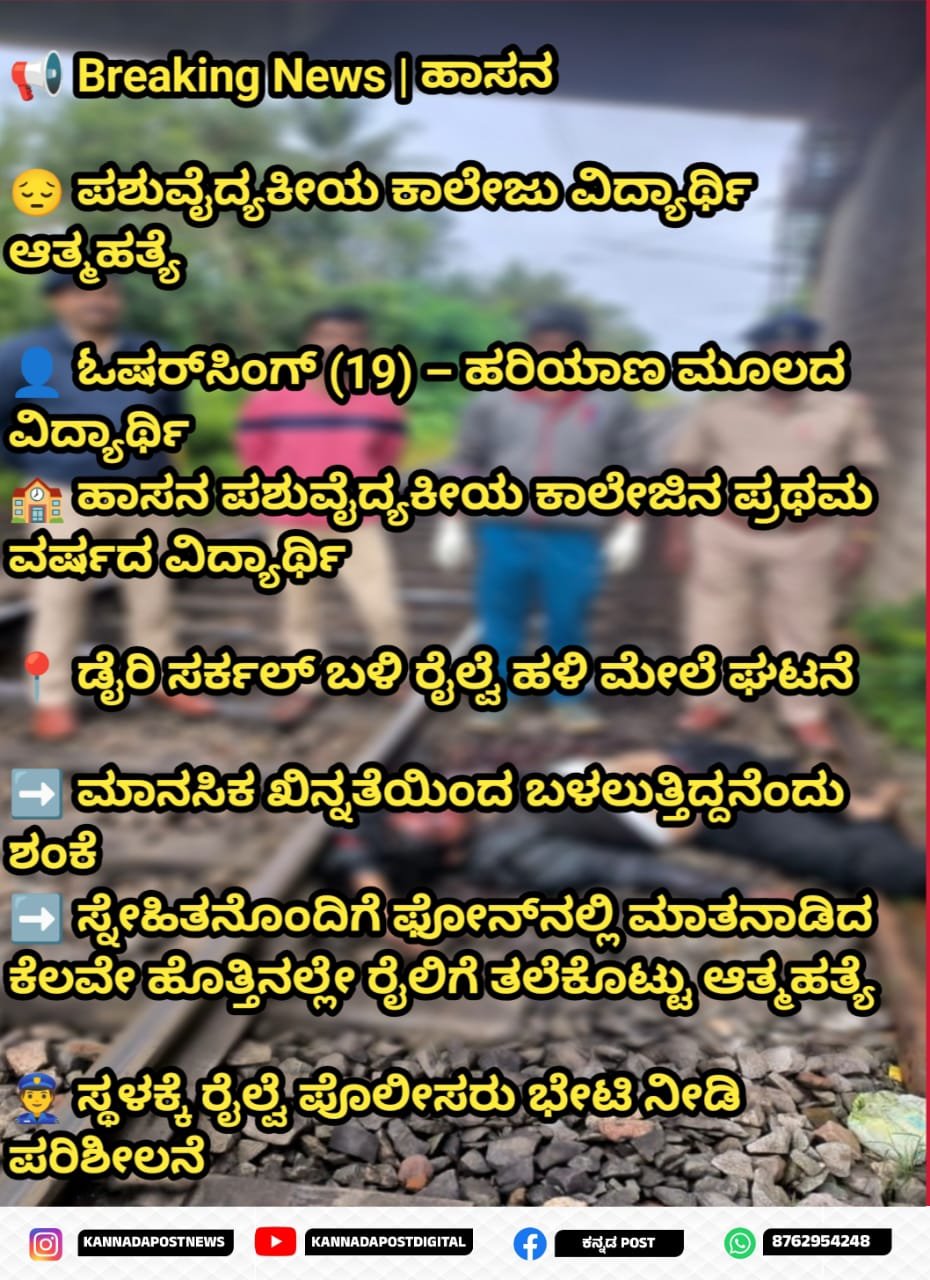 ಹಾಸನ: ಹಾಸನ ನಗರದಲ್ಲಿ ರೈಲಿಗೆ ತಲೆಕೊಟ್ಟು ಪಶುವೈದ್ಯಕೀಯ ಕಾಲೇಜಿನ ವಿದ್ಯಾರ್ಥಿಯೊಬ್ಬ ಆತ್ಮಹತ್ಯೆಗೆ ಶರಣಾಗಿರುವ ದಾರುಣ ಘಟನೆ ನಡೆದಿದೆ.