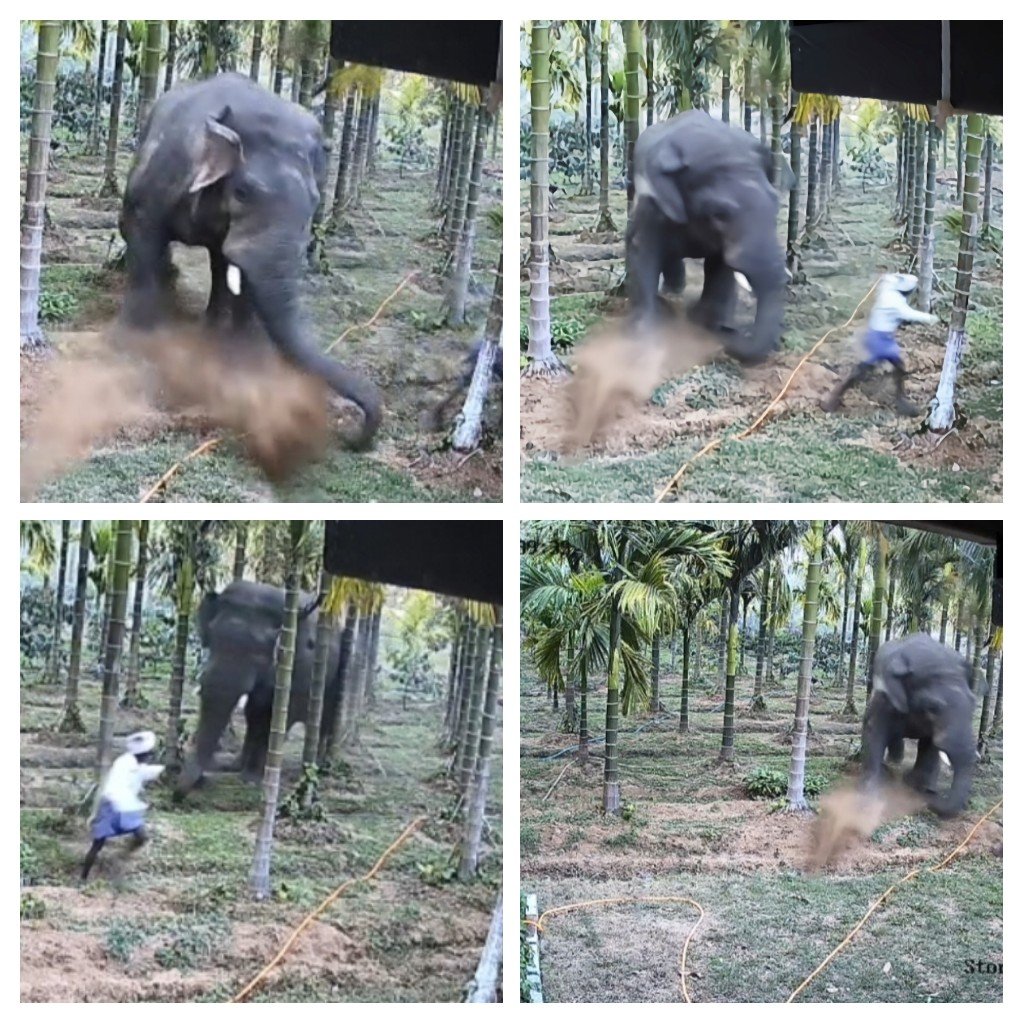 ಕೆಲಸ ಮಾಡುತ್ತಿದ್ದ ಇಬ್ಬರು ಕೂಲಿ ಕಾರ್ಮಿಕರ ಗಮನಕ್ಕೆ ಬಾರದಂತೆ ಸಮೀಪಿಸಿದ ಕರಡಿ ಏಕಾಏಕಿ ದಾಳಿ ನಡೆದಿದೆ. ತಕ್ಷಣ ಎಚ್ಚೆತ್ತ ಕೆಲಸಗಾರರು ಎಚ್ಚೆತ್ತು ಓಡಿದ್ದಾರೆ. ಅವರಲ್ಲಿ ಒಬ್ಬನ ಬೆನ್ನು ಹತ್ತಿದ ಆನೆ ಬೀಸಿದ ಸೊಂಡಲಿನಿಂದ ಒಬ್ಬಾತ ಕೂದಲೆಳೆ ಅಂತರದಲ್ಲಿ ಪಾರಾಗಿದ್ದಾನೆ.