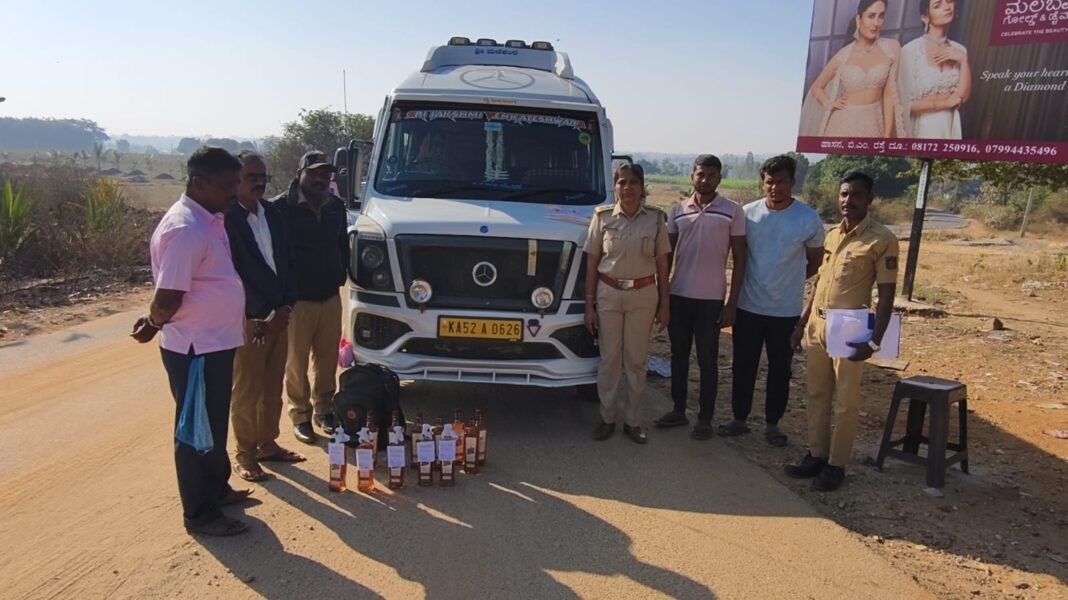 ಕೆಎ-52-ಎ-0626 ನೋಂದಣಿ ಸಂಖ್ಯೆಯ ಟಿಟಿ ವಾಹನದಲ್ಲಿ 750 ಎಂಎಲ್ ಸಾಮರ್ಥ್ಯದ 12 ಬಾಟಲ್ ಗೋವಾ ಮದ್ಯವನ್ನು ತುಂಬಿಸಿಕೊಂಡು ಪುರದಮ್ಮ ದೇವಾಲಯದ ಕಡೆಗೆ ತೆರಳುತ್ತಿದ್ದ ಯುವಕರನ್ನು ಪೊಲೀಸರು ತಡೆದರು. ಅಕ್ರಮ ಮದ್ಯ ಪತ್ತೆಯಾದ್ದರಿಙದ ವಾಹನ ಮತ್ತು ಮದ್ಯವನ್ನು ವಶಪಡಿಸಿಕೊಂಡು ಆರೋಪಿಗಳನ್ನು ಬಂಧಿಸಿದರು.