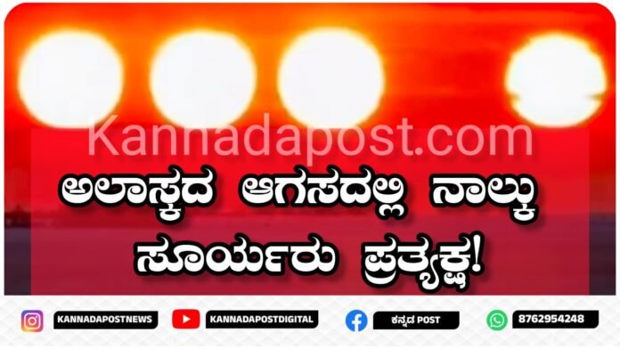 ಅಲಾಸ್ಕಾ | ಫೆಬ್ರವರಿ 2, 2026: ಅಲಾಸ್ಕಾದ ಆಕಾಶದಲ್ಲಿ ಸೂರ್ಯಾಸ್ತದ ವೇಳೆಯಲ್ಲಿ ನಾಲ್ಕು ಸೂರ್ಯಗಳು ಒಂದೇ ಸಾಲಿನಲ್ಲಿ ಕಾಣುವಂತೆ ತೋರಿದ ಅಪರೂಪದ ದೃಶ್ಯವು ವಿಜ್ಞಾನಿಗಳ ಮತ್ತು ಆಕಾಶಪ್ರೇಮಿಗಳ ಗಮನ ಸೆಳೆದಿದೆ. ಈ ದೃಶ್ಯವನ್ನು ಅಧಿಕೃತವಾಗಿ ದಾಖಲಿಸಲಾಗಿದ್ದು, ಇದನ್ನು ಕ್ವಾಡ್ರುಪಲ್ ಪಾರ್ಹೆಲಿಯನ್ (Quadruple Parhelion) ಅಥವಾ ಸಂಕೀರ್ಣ ಸನ್ಡಾಗ್ (Complex Sundog) ಎಂಬ ಅಪರೂಪದ ವಾತಾವರಣೀಯ ಪ್ರಕಾಶೀಯ ವಿದ್ಯಮಾನವೆಂದು ಗುರುತಿಸಲಾಗಿದೆ.