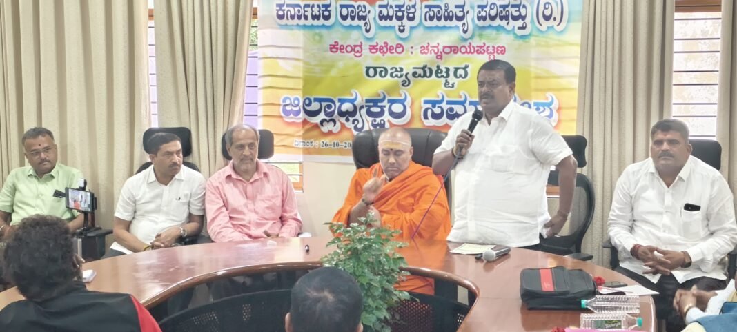 ತಾಲ್ಲೂಕಿನ ಶ್ರವಣಬೆಳಗೊಳದಲ್ಲಿ ರಾಜ್ಯ ಮಕ್ಕಳ ಸಾಹಿತ್ಯ ಪರಿಷತ್ ವತಿಯಿಂದ ಭಾನುವಾರ ಹಮ್ಮಿಕೊಂಡಿದ್ದ ಜಿಲ್ಲಾಧ್ಯಕ್ಷರ ಸಮಾವೇಶ ಕಾರ್ಯಕ್ರಮವನ್ನು ಉದ್ಘಾಟಿಸಿ ಮಾತನಾಡಿ, ಸಾಹಿತ್ಯಕ್ಕೆ ಯಾವುದೇ ಧರ್ಮ, ಜಾತಿ ಹಾಗೂ ಭಾಷೆ ಎಂಬ ಭೇದವಿಲ್ಲ ಎಂದು ಆಶೀರ್ವಚನ ನೀಡಿದರು.
