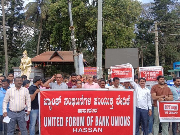 ಹಾಸನ: ಭಾರತೀಯ ಬ್ಯಾಂಕ್ ಗಳ ಸಂಘಟನೆ (IBA) ಹಾಗೂ ಬ್ಯಾಂಕ್ ಸಿಬ್ಬಂದಿ ಸಂಘಟನೆಗಳೊಂದಿಗೆ 2023ರಲ್ಲಿ 12ನೇ ದ್ವಿಪಕ್ಷೀಯ ಒಪ್ಪಂದದ ಪ್ರಕಾರ ಐದು ದಿನ ಬ್ಯಾಂಕಿಂಗ್ ಸೌಲಭ್ಯವನ್ನು ಜಾರಿಗೊಳಿಸುವಂತೆ ಆಗ್ರಹಿಸಿ ಬ್ಯಾಂಕ್ ಸಂಘಟನೆಗಳ ಸಂಯುಕ್ತ ವೇದಿಕೆಯು (UFBU)ಇಂದು ದೇಶವ್ಯಾಪಿ ಬ್ಯಾಂಕ್ ಮುಷ್ಕರಕ್ಕೆ ಕರೆ ನೀಡಿತ್ತು.
