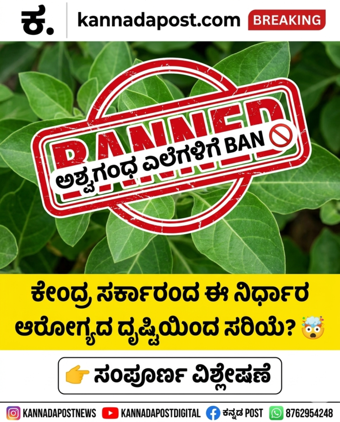 ಆಹಾರಪದಾರ್ಥಗಳಲ್ಲಿ Ashwagandha ಅಶ್ವಗಂಧ ಎಲೆಗಳ ಬಳಕೆಯನ್ನು ನಿಷೇಧಿಸುವ ಕುರಿತು ಕೇಂದ್ರ ಸರ್ಕಾರ ಕೈಗೊಂಡಿರುವ ನಿರ್ಧಾರವು ಆರೋಗ್ಯ, ಆಯುರ್ವೇದ ಮತ್ತು ಆಹಾರ ಸುರಕ್ಷತೆ ನಡುವಿನ ಸೂಕ್ಷ್ಮ ಸಮತೋಲನವನ್ನು ಮತ್ತೆ ಚರ್ಚೆಗೆ ತಂದಿದೆ. ಈ ವಿಷಯದ ಸವಿಸ್ತಾರ ವಿಶ್ಲೇಷಣೆಯನ್ನು ನೋಡೋಣ.