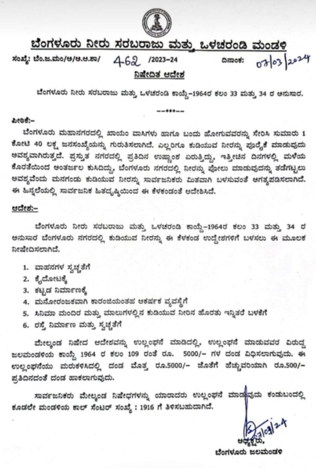 ಪ್ರಸ್ತುತ ನಗರದಲ್ಲಿ ಪ್ರತಿದಿನ ಉಷ್ಣಾಂಶ ಎರುತ್ತಿದ್ದು, ಇತ್ತೀಚಿನ ದಿನಗಳಲ್ಲಿ ಮಳೆಯ ಕೊರತೆಯಿಂದ ಅಂತರ್ಜಲ ಕುಸಿದಿದ್ದು, ಬೆಂಗಳೂರು ನಗರದಲ್ಲಿ ನೀರನ್ನು ಪೋಲು ಮಾಡುವುದನ್ನು ತಡೆಗಟ್ಟಲು ಅವಶ್ಯವೆಂದು ಮನಗಂಡು ಕುಡಿಯುವ ನೀರನ್ನು ಸಾರ್ವಜನಿಕರು ಮಿತವಾಗಿ ಬಳಸುವಂತೆ ಆಗತ್ಯಪಡಿಸಲಾಗಿದೆ. ಈ ಹಿನ್ನಲೆಯಲ್ಲಿ ಸಾರ್ವಜನಿಕ ಹಿತದೃಷ್ಟಿಯಿಂದ ಈ ಕೆಳಕಂಡಂತೆ ಆದೇಶಿಸಿದೆ.