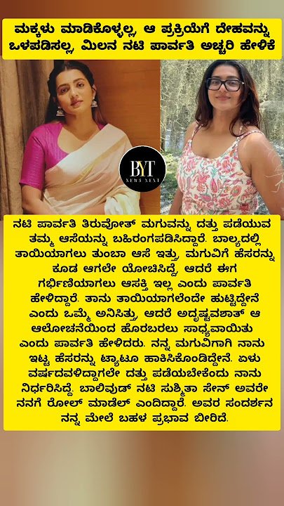 ಬೆಂಗಳೂರು: ಕನ್ನಡದ ಸೂಪರ್ ಹಿಟ್ ಸಿನಿಮಾ ಮಿಲನ ಮೂಲಕ ಪುನೀತ್ ರಾಜ್ಕುಮಾರ್ ಜೊತೆ ಸಿನಿಪ್ರೇಕ್ಷಕರ ಮನಗೆದ್ದ ನಟಿ ಪಾರ್ವತಿ ತಿರುವೋತ್ ಇದೀಗ ತಾಯಿತನ, ಗರ್ಭಧಾರಣೆ ಕುರಿತ ತಮ್ಮ ಸ್ಪಷ್ಟ ನಿಲುವಿನಿಂದ ಮತ್ತೆ ಸುದ್ದಿಯಾಗಿದ್ದಾರೆ. ಮಕ್ಕಳು ಮಾಡಿಕೊಳ್ಳುವ ಪ್ರಕ್ರಿಯೆಗೆ ದೇಹವನ್ನು ಒಳಪಡಿಸಲು ಆಸಕ್ತಿ ಇಲ್ಲ ಎಂದು ಪಾರ್ವತಿ ಹೇಳಿರುವುದು ಭಾರಿ ಚರ್ಚೆಗೆ ಕಾರಣವಾಗಿದೆ.