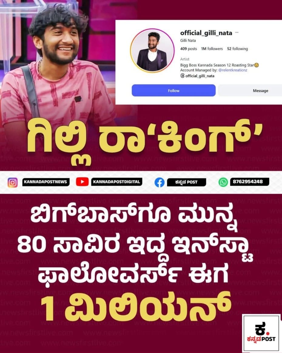 ಬಿಗ್ ಬಾಸ್ ಮನೆಗೆ ಪ್ರವೇಶಿಸುವ ಮೊದಲು ಗಿಲ್ಲಿ ನಟ ಅಲಿಯಾಸ್ ನಟರಾಜು ಇನ್ಸಟಾಗ್ರಾಮ್ನಲ್ಲಿ ಸುಮಾರು 80 ಸಾವಿರ ಫಾಲೋವರ್ಸ್ ಹೊಂದಿದ್ದರು. ಆದರೆ, ಬಿಗ್ ಬಾಸ್ ಶೋಗೆ ಕಾಲಿಟ್ಟ ನಂತರ ಕೇವಲ 100 ದಿನಗಳ ಅವಧಿಯಲ್ಲಿ ಅವರ ಫಾಲೋವರ್ಸ್ ಸಂಖ್ಯೆ 1 ಮಿಲಿಯನ್ (10 ಲಕ್ಷ) ದಾಟಿದೆ. ಇದೀಗ ಗಿಲ್ಲಿ ನಟನ ಇನ್ಸಟಾಗ್ರಾಮ್ ಖಾತೆಗೆ 10 ಲಕ್ಷಕ್ಕೂ ಅಧಿಕ ಫಾಲೋವರ್ಸ್ ಇದ್ದಾರೆ.