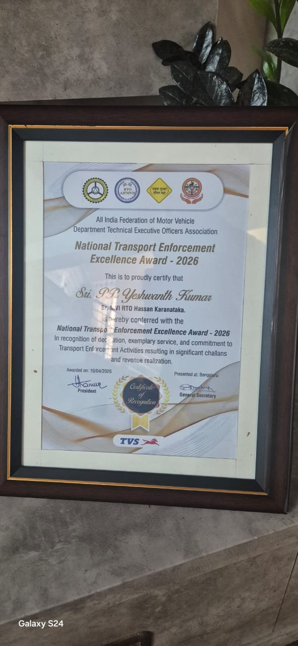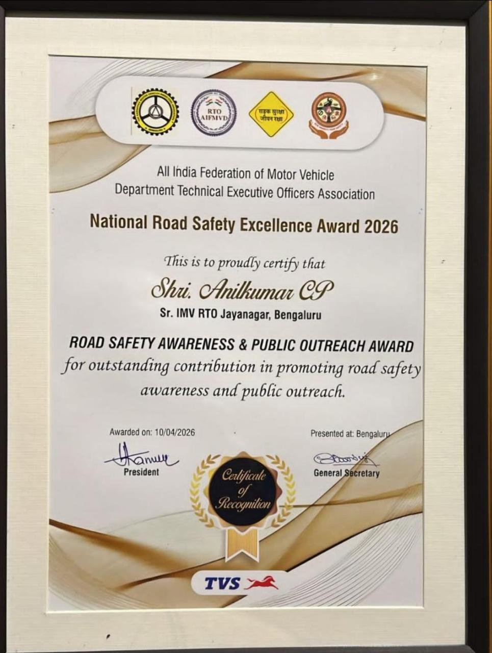 ಬೆಂಗಳೂರು ಯಲಹಂಕದಲ್ಲಿ ಶುಕ್ರವಾರ ಸಂಜೆ ನಡೆದ ಅಖಿಲ ಭಾರತ ಮೋಟಾರು ವಾಹನ ತಾಂತ್ರಿಕ ಸಿಬ್ಬಂದಿಗಳ ಒಕ್ಕೂಟದ ವಾರ್ಷಿಕ ಸಮ್ಮೇಳನದಲ್ಲಿ ಇವರಿಗೆ ‘ನ್ಯಾಷನಲ್ ಟ್ರಾನ್ಸ್ಪೋರ್ಟ್ ಎನ್ಫೋರ್ಸ್ಮೆಂಟ್ ಎಕ್ಸಲೆನ್ಸ್ ಅವಾರ್ಡ್ 2026’ ಪ್ರದಾನ ಮಾಡಲಾಯಿತು.