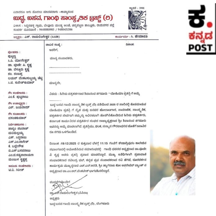 Buddha Basava Gandhi Cultural Trust (R), Bangalore. Shivanand Tagadur, the state president of the Karnataka Working Journalists’ Association, has been selected for the Lohia Award, which is given every year this time (2025th row).