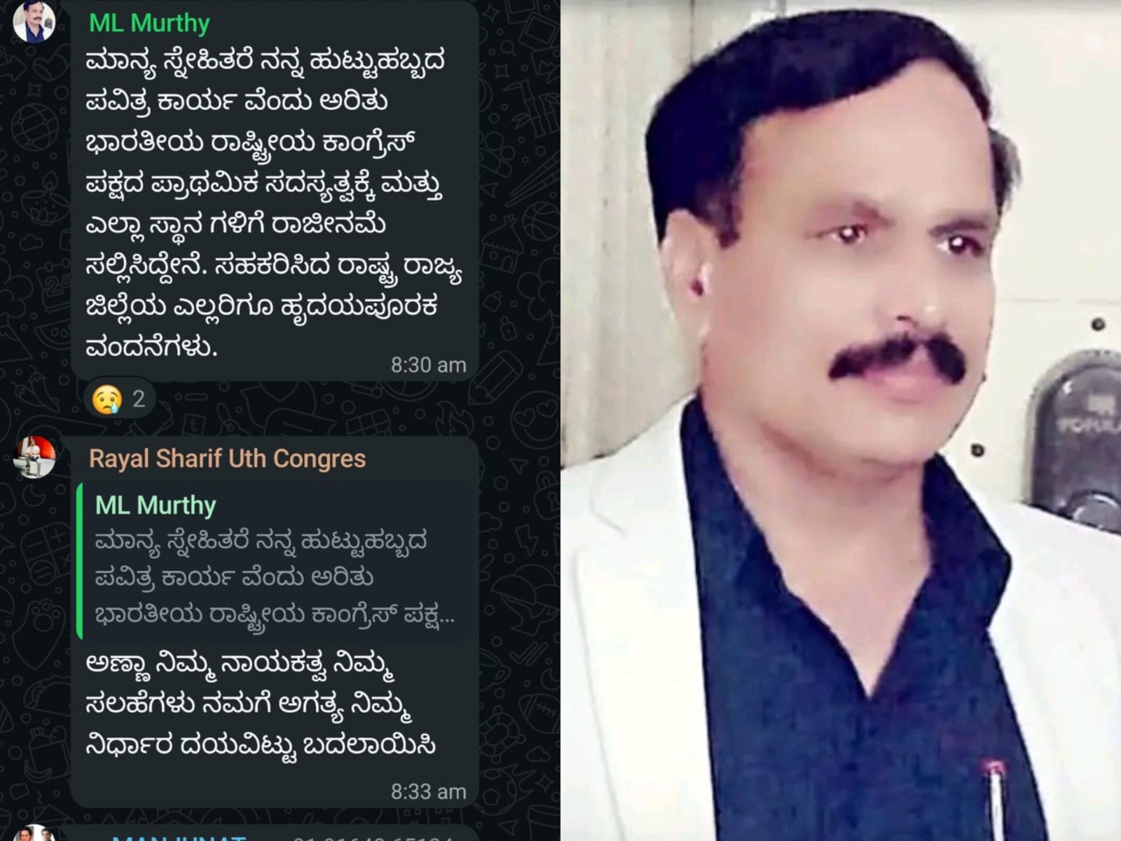 40 ವರ್ಷಗಳಿಂದ ಕಾಂಗ್ರೆಸ್ ಪಕ್ಷದಲ್ಲಿ ಸಕ್ರಿಯರಾಗಿದ್ದ ಎಂ.ಎಲ್. ಮೂರ್ತಿ, ಪಕ್ಷ ಅಧಿಕಾರಕ್ಕೆ ಬಂದರೂ ಯಾವುದೇ ಹುದ್ದೆ ನೀಡದಿರುವುದರ ಬಗ್ಗೆ ಅಸಮಾಧಾನ ವ್ಯಕ್ತಪಡಿಸಿದ್ದಾರೆ. ಜಿಲ್ಲೆಯಲ್ಲಿ ಕಾಂಗ್ರೆಸ್ ಕ್ಲೀನ್ ಸ್ವೀಪ್ ಮಾಡಿದರೂ, ನಾಯಕರ ನಡುವೆ ಹೊಂದಾಣಿಕೆ ಕೊರತೆ ಇರುವುದೇ ಈ ಬೆಳವಣಿಗೆಗೆ ಕಾರಣ ಎನ್ನಲಾಗಿದೆ.