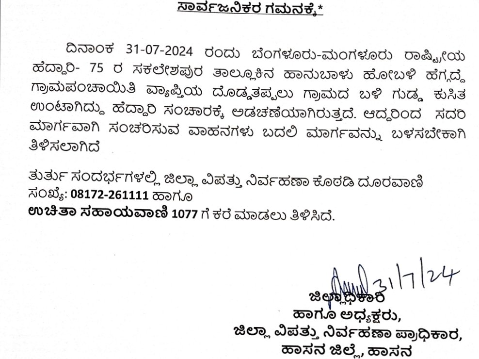 ಮಳೆ‌ ಸುರಿಯುತ್ತಿರುವುದರಿಂದ ಮತ್ತೆ ಭೂಕುಸಿತದ ಆತಂಕವಿದೆ. ಈ ಕಾರಣದಿಂದ ವಾಹನಗಳು ಬದಲಿ ಮಾರ್ಗದಲ್ಲಿ ಸಂಚರಿಸಬೇಕು. ತುರ್ತು ಸಂದರ್ಭದಲ್ಲಿ ಜಿಲ್ಲಾ ವಿಪತ್ತು ನಿರ್ವಹಣಾ ಕೇಂದ್ರದ ದೂ.ಸಂ. 08172-261111 ಅಥವಾ ಉಚಿತ ಸಹಾಯವಾಣಿ ಸಂಖ್ಯೆ 1077 ಸಂಪರ್ಕಿಸುವಂತೆ ಅವರು ಪ್ರಕಟಣೆಯಲ್ಲಿ ತಿಳಿಸಿದ್ದಾರೆ.
