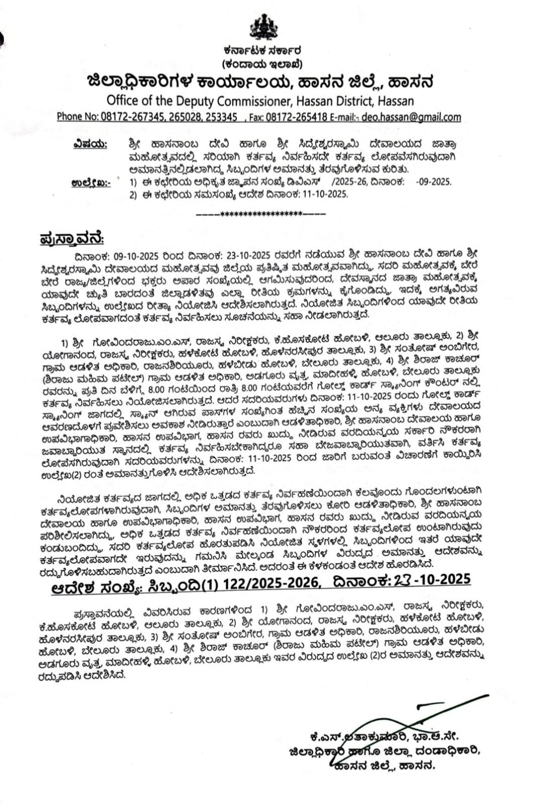 ರಾಜಸ್ವ ನಿರೀಕ್ಷಕಾರದ ಎಂ.ಎಸ್. ಗೋವಿಂದರಾಜು (ಕೆ.ಹೊಸಕೋಟೆ), ಯೋಗಾನಂದ (ಹೊಳೆನರಸೀಪುರ), ಸಂತೋಷ್ ಅಂಬಿಗರ್ (ಗ್ರಾಮ ಆಡಳಿತಾಧಿಕಾರಿ), ಶಿರಾಜ್ ಕುಮಾರ್ (ಗ್ರಾಮ ಆಡಳಿತ ಅಧಿಕಾರಿ) ಅವರ ಅಮಾನತು ಆದೇಶವನ್ನು ರದ್ದುಗೊಳಿಸಿ ಆದೇಶಿಸಲಾಗಿದೆ.