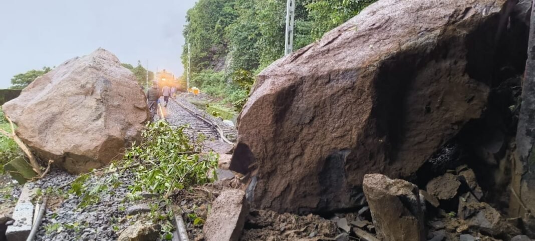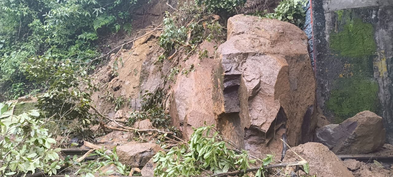 ಅರೆಬೆಟ್ಟ ಮತ್ತು ಯಡಕುಮಾರಿ ಮಧ್ಯ ಭಾಗದಲ್ಲಿ ಗುಡ್ಡ ಕುಸಿತವಾಗಿದ್ದು, ರೈಲ್ವೆ ಸಿಬ್ಬಂದಿಗಳು ಗುಡ್ಡ ತೆರವುಗೊಳಿಸುವ ಕಾರ್ಯದಲ್ಲಿ ತೊಡಗಿದ್ದಾರೆ.