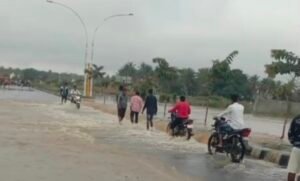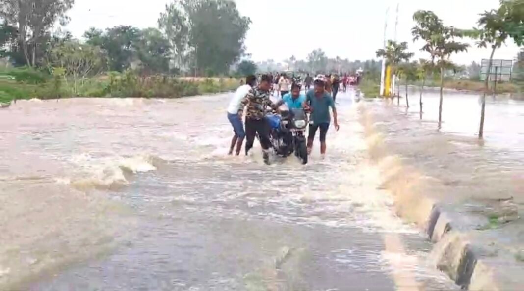 ರಸ್ತೆಯಲ್ಲಿ ಗುಂಡಿ ಬಿದ್ದಿದ್ದು ವಾಹನ ಸಂಪರ್ಕವೇ ಕಡಿತಗೊಂಡಿದೆ. ವಾಹನ ಸವಾರರು ನೀರಿನಲ್ಲಿ ಬೈಕ್ ಚಲಾಯಿಸಲು ಹೋಗಿ ಕೆಳಗೆ ಬಿದ್ದು ಅವರನ್ನು ಸ್ಥಳೀಯರು ರಕ್ಷಿಸಿದ್ದಾರೆ.