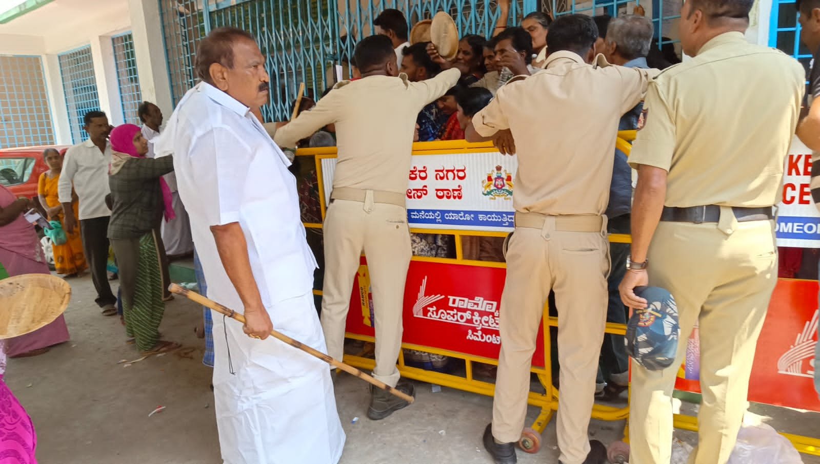 ಅರಸೀಕೆರೆ ಎಪಿಎಂಸಿ ಮುಂದೆ ನೂಕುನುಗ್ಗಲು ಉಂಟಾಗಿದ್ದು, ವಿಷಯ ತಿಳಿದು ಬೆಳಿಗ್ಗೆಯೇ ಎಪಿಎಂಸಿ ಆವರಣಕ್ಕೆ ಬಂದ ಸ್ಥಳೀಯ ಶಾಸಕ ಕೆ.ಎಂ.ಶಿವಲಿಂಗೇಗೌಡ, ಲಾಠಿ ಹಿಡಿದು ರೈತರು ಸರದಿ ಸಾಲು ಉಲ್ಲಂಘಿಸದಂತೆ ನಿಯಂತ್ರಿಸಿದರು.