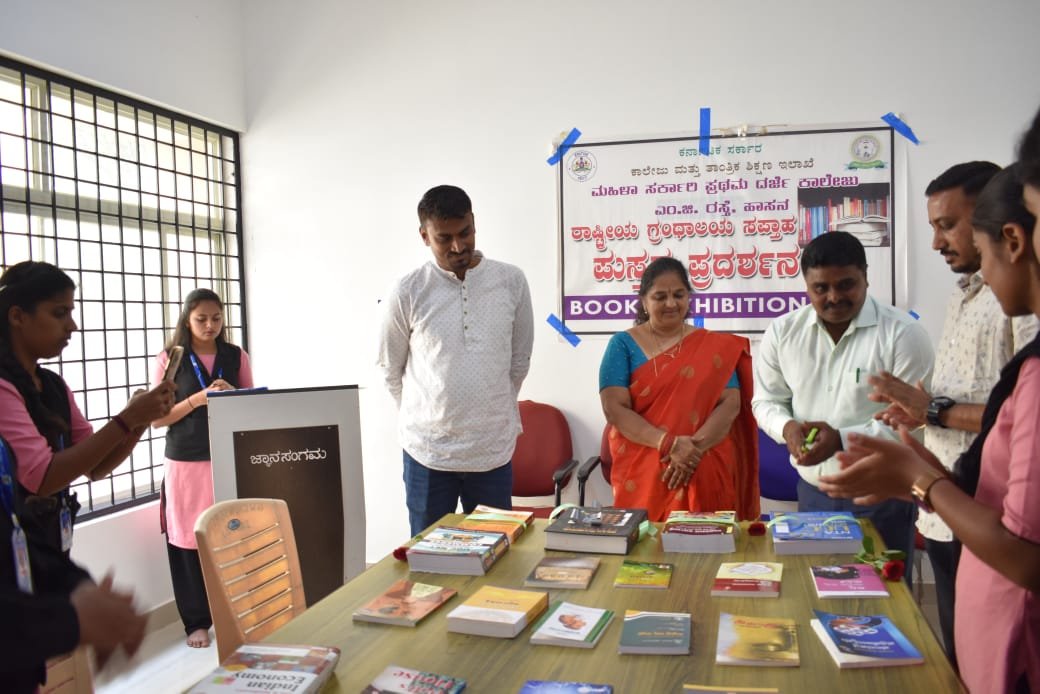 ಹಾಸನ: ನಗರದ ಎಂ.ಜಿ.ರಸ್ತೆಯ ಮಹಿಳಾ ಸರ್ಕಾರಿ ಪ್ರಥಮ ದರ್ಜೆ ಕಾಲೇಜಿನಲ್ಲಿ ಗ್ರಂಥಾಲಯ ಮತ್ತು ಮಾಹಿತಿ ಕೇಂದ್ರ ಹಾಗೂ ಪತ್ರಿಕೋದ್ಯಮ ವಿಭಾಗದ ಸಹಯೋಗದೊಂದಿಗೆ ಪುಸ್ತಕ ಪ್ರದರ್ಶನ ಮೇಳ ನಡೆಯಿತು.