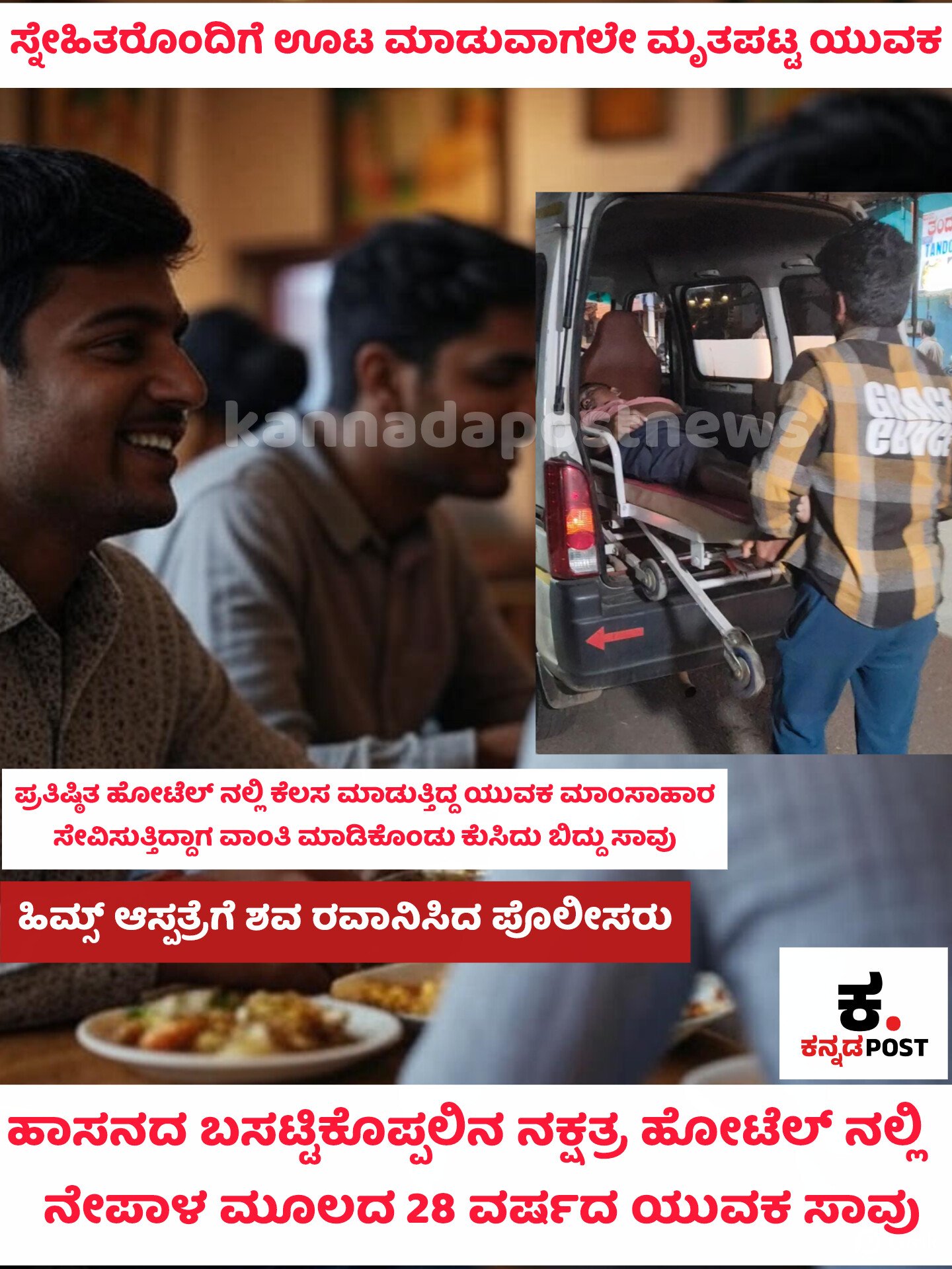 ನೇಪಾಳ ಮೂಲದ ಅಂದಾಜು 28 ವರ್ಷದ ಯುವಕ ಮೃತಪಟ್ಟಿದ್ದಾನೆ. ನಗರದ ಬಿಎಂ ರಸ್ತೆಯ ಪ್ರತಿಷ್ಠಿತ ಹೋಟೆಲ್ ವೊಂದರಲ್ಲಿ ಯುವಕ ಕೆಲಸ ಮಾಡಿಕೊಂಡಿದ್ದ ಆತ ಸ್ನೇಹಿತರೊಂದಿಗೆ ಬಸಟ್ಟಿಕೊಪ್ಪಲಿನ ಮಾಂಸಾಹಾರಿ ಹೋಟೆಲ್ ಗೆ ಊಟಕ್ಕೆ ಬಂದಿದ್ದ.