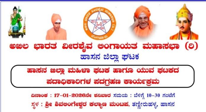 ಹಾಸನ: ಅಖಿಲ ಭಾರತ ವೀರಶೈವ ಲಿಂಗಾಯತ ಮಹಾಸಭಾ (ರಿ) ಹಾಸನ ಜಿಲ್ಲಾ ಘಟಕದ ವತಿಯಿಂದ ಹಾಸನ ಜಿಲ್ಲಾ ಮಹಿಳಾ ಘಟಕ ಹಾಗೂ ಯುವ ಘಟಕದ ನೂತನ ಪದಾಧಿಕಾರಿಗಳ ಪದಗ್ರಹಣ ಕಾರ್ಯಕ್ರಮವನ್ನು ಜನವರಿ 17, 2026ರ ಶನಿವಾರ ಬೆಳಿಗ್ಗೆ 10.30 ಗಂಟೆಗೆ ತಣ್ಣೀರುಹಳ್ಳದಲ್ಲಿರುವ ಶ್ರೀ ಶಿವಲಿಂಗೇಶ್ವರ ಕಲ್ಯಾಣ ಮಂಟಪದಲ್ಲಿ ಆಯೋಜಿಸಲಾಗಿದೆ.