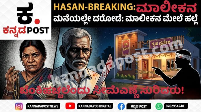 Hassan|ಹಾಸನ: ತಾಲ್ಲೂಕಿನ ಚಿಕ್ಕಗದ್ದವಳ್ಳಿ ಗ್ರಾಮದಲ್ಲಿ ತಡರಾತ್ರಿ ಭೀಕರ ಘಟನೆಯೊಂದು ಸಂಭವಿಸಿದೆ. ಹೊಸ ಮನೆಯ ಗೃಹಪ್ರವೇಶ ಮುಗಿಸಿದ ಸಂಭ್ರಮದಲ್ಲಿದ್ದ ಕುಟುಂಬವೊಂದರ ಮೇಲೆ ಅದೇ ಗ್ರಾಮದ ದಂಪತಿಗಳು ಮಾರಣಾಂತಿಕ ಹಲ್ಲೆ ನಡೆಸಿ, ಚಿನ್ನಾಭರಣ ಹಾಗೂ ನಗದು ದೋಚಿ ಪರಾರಿಯಾಗಿದ್ದಾರೆ.