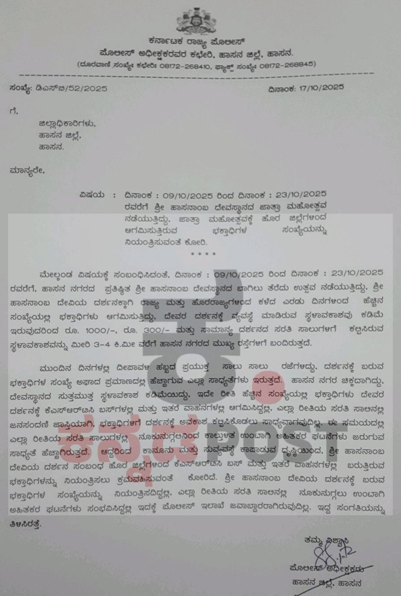 “ಹೊರ ಜಿಲ್ಲೆಗಳಿಂದ ಕೆಎಸ್ಆರ್ಟಿಸಿ ಬಸ್ಗಳಲ್ಲಿ ಹಾಗೂ ಖಾಸಗಿ ವಾಹನಗಳಲ್ಲಿ ಆಗಮಿಸುತ್ತಿರುವ ಭಕ್ತರನ್ನು ನಿಯಂತ್ರಿಸಲು ಕ್ರಮ ಕೈಗೊಳ್ಳದಿದ್ದಲ್ಲಿ, ಯಾವುದೇ ಅಹಿತಕರ ಘಟನೆ ಸಂಭವಿಸಿದರೆ ಪೊಲೀಸ್ ಇಲಾಖೆ ಜವಾಬ್ದಾರಿಯಲ್ಲ.”