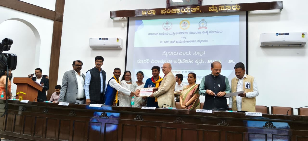 ಕರ್ನಾಟಕ ಕಾನೂನು ಮತ್ತು ಸುಧಾರಣಾ ಸಂಸ್ಥೆ ಬೆಂಗಳೂರು ಹಾಗೂ ಜೆಎಸ್ಎಸ್ ಕಾನೂನು ಕಾಲೇಜು ಮೈಸೂರು ಅವರ ಸಂಯುಕ್ತ ಆಶ್ರಯದಲ್ಲಿ ಮೈಸೂರಿನ ಜಿಲ್ಲಾ ಪಂಚಾಯತ್ ಸಭಾಂಗಣದಲ್ಲಿ 2025ರ ಮೈಸೂರು ವಲಯ ಮಟ್ಟದ ಮಾದರಿ ವಿಧಾನಸಭಾ ಅಧಿವೇಶನ ಸ್ಪರ್ಧೆ ವಿಜೃಂಭಣೆಯಿಂದ ನೆರವೇರಿದ್ದು. ಸಂಸತ್ತೀಯ ನಡವಳಿಕೆಯ ಪ್ರದರ್ಶನದಲ್ಲಿ, ಹಾಸನದ ಎಂ. ಕೃಷ್ಣ ಕಾನೂನು ಕಾಲೇಜಿನ ವಿದ್ಯಾರ್ಥಿ ಕೀರ್ತಿರಾಜ್ ಅವರು ತಮ್ಮ ವಾಗ್ಪಟುತ್ವ, ಸಂಸದೀಯ ಪ್ರಜ್ಞೆ ಮತ್ತು ವಿಶ್ಲೇಷಣಾತ್ಮಕ ಪ್ರಸ್ತುತಿಯಿಂದ ಎಲ್ಲರ ಮೆಚ್ಚುಗೆ ಪಡೆದು, ವಿರೋಧಪಕ್ಷದ ನಾಯಕನ ಪಾತ್ರವನ್ನು ನಿರ್ವಹಿಸಿದ್ದರು.