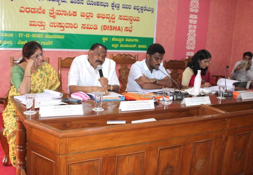 ಜಿಲ್ಲಾ ಪಂಚಾಯತಿ ಹೊಯ್ಸಳ ಸಭಾಂಗಣದಲ್ಲಿಂದು ನಡೆದ ತ್ರೈಮಾಸಿಕ ಜಿಲ್ಲಾ ಅಭಿವೃದ್ಧಿ ಸಮನ್ವಯ ಮತ್ತು ಉಸ್ತುವಾರಿ ಸಮಿತಿ ಪ್ರಗತಿ ಪರಿಶೀಲನಾ ಸಭೆಯ ಅಧ್ಯಕ್ಷತೆ ವಹಿಸಿ ಮಾತನಾಡಿ, ಹವಾಮಾನ ವೈಪರೀತ್ಯ ಹಿನ್ನೆಲೆ ಆರೋಗ್ಯ ಸೌಲಭ್ಯಗಳನ್ನು ಸುಸಜ್ಜಿತವಾಗಿ ಇಟ್ಟುಕೊಳ್ಳಬೇಕೆಂದರು.