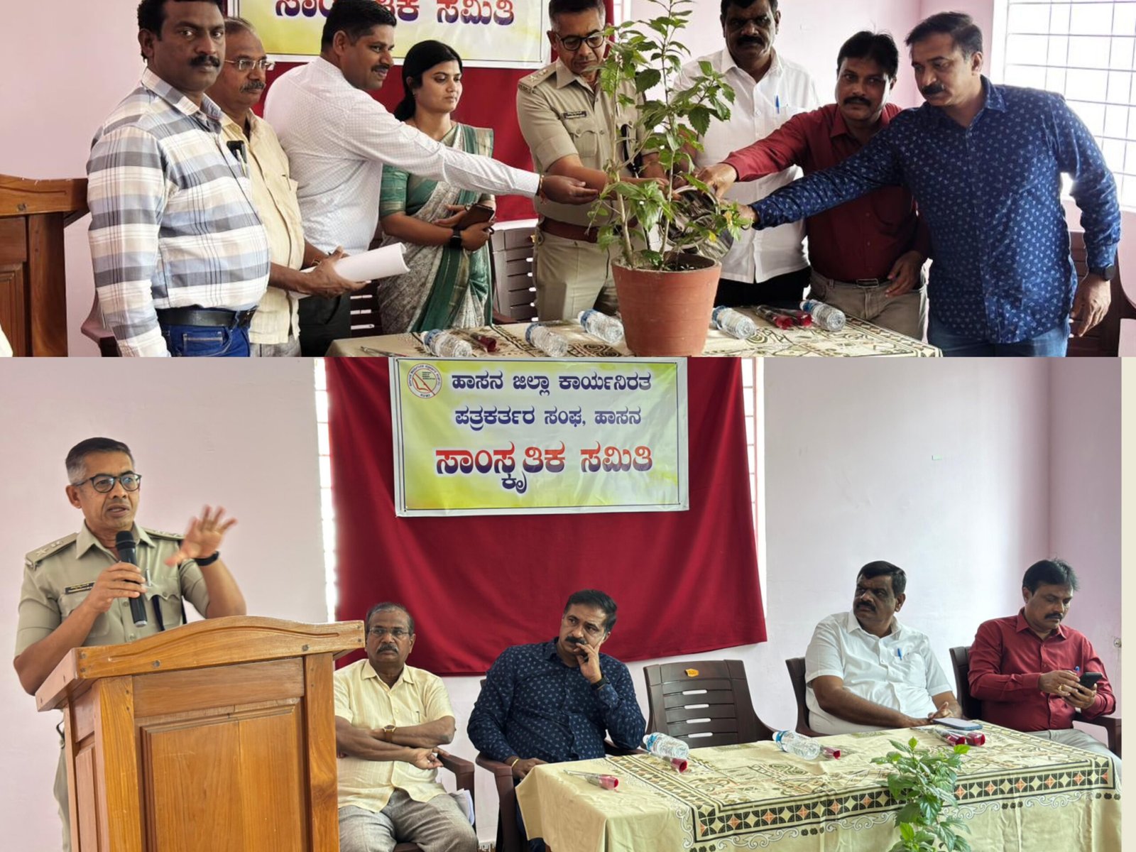 ಹಾಸನ: ಹಾಸನ ಜಿಲ್ಲಾ ಪತ್ರಕರ್ತರ ಸಂಘದ ಸಾಂಸ್ಕೃತಿಕ ಸಮಿತಿ ವತಿಯಿಂದ ಅಪರಾಧ ಸುದ್ದಿ-ಪರಿಣಾಮಗಳು, ಸ್ಟಡೀ ವಿತ್ ಸೊಸೈಟಿ ಹೆಸರಿನಲ್ಲಿ ಹೆಚ್ಚುವರಿ ಪೊಲೀಸ್ ವರಿಷ್ಠಾಧಿಕಾರಿ ಎಂ.ಕೆ.ತಮ್ಮಯ್ಯ ಅವರೊಂದಿಗೆ ಸಂವಾದ ಕಾರ್ಯಕ್ರಮ ಹಮ್ಮಿಕೊಳ್ಳಲಾಗಿತ್ತು.