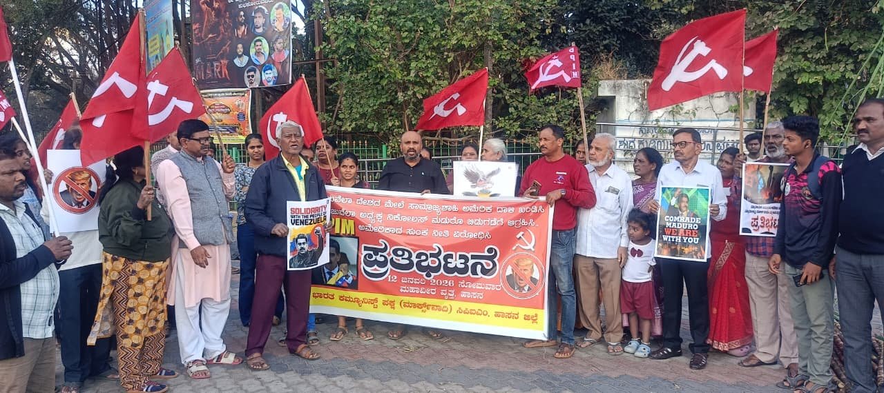 ಭಾರತ ಕಮ್ಯೂನಿಸ್ಟ್ ಪಕ್ಷ (ಮಾರ್ಕ್ಸ್ವಾದಿ) ಹಾಸನ ಜಿಲ್ಲಾ ಸಮಿತಿಯ ವತಿಯಿಂದ ನಗರದ ಮಹಾವೀರ ವೃತ್ತದಲ್ಲಿ “ವೆನುಜುವೆಲಾ ದೇಶದ ಮೇಲೆ ಸಾಮ್ರಾಜ್ಯಶಾಹಿ ಅಮೆರಿಕಾದ ದಾಳಿ ಖಂಡಿಸಿ, ವೆನುಜುವೆಲಾದ ಅಧ್ಯಕ್ಷ ನಿಕೊಲೊಸ್ ಮಡುರೋ ಹಾಗೂ ಅವರ ಪತ್ನಿ ಬಿಡುಗಡೆಗೆ ಆಗ್ರಹಿಸಿ, ಅಮೆರಿಕಾದ ಸುಂಕ ನೀತಿಗೆ ವಿರೋಧವಾಗಿ” ಆಯೋಜಿಸಿದ್ದ ಪ್ರತಿಭಟನೆಯನ್ನು ಉದ್ದೇಶಿಸಿ ಅವರು ಮಾತನಾಡಿದರು.