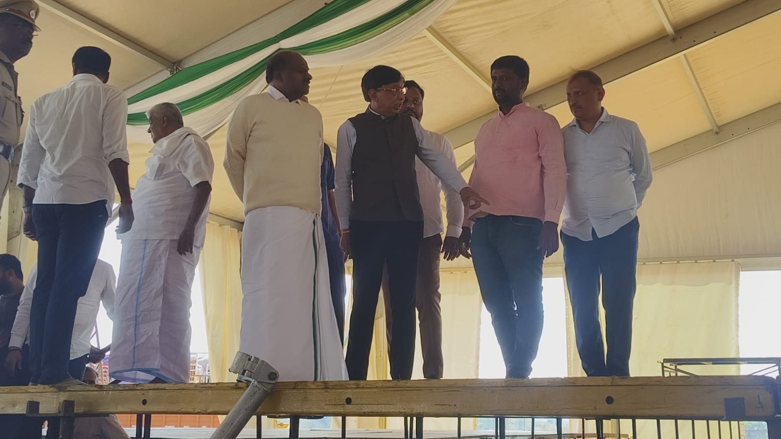 ಹಾಸನ: ಜ. 24 ರಂದು ಹಾಸನದಲ್ಲಿ ಹಮ್ಮಿಕೊಂಡಿರುವ ಜೆಡಿಎಸ್ ಸಮಾವೇಶ ಸ್ಥಳವನ್ನು ಕೇಂದ್ರ ಸಚಿವ ಹೆಚ್.ಡಿ.ಕುಮಾರಸ್ವಾಮಿ ಪರಿಶೀಲಿಸಿದರು. ವಾಸ್ತು ಶಾಸ್ತ್ರಕ್ಕೆ ಮಹತ್ವ ನೀಡಿದ ಎಚ್.ಡಿ.ಕುಮಾರಸ್ವಾಮಿ ಅವರನ್ನು ಅವರ ಸಹೋದರ ಎಚ್.ಡಿ.ರೇವಣ್ಣ ಅವರು ವಾಸ್ತು ಪ್ರಕಾರವೇ ವೇದಿಕೆಯತ್ತ ಕರೆದುಕೊಂಡು ಬಂದರು.