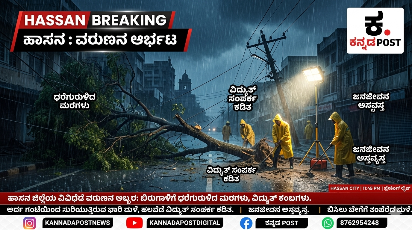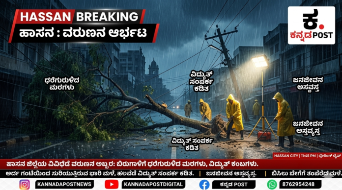 Hassan|ಹಾಸನ (Kannada Post): ಬಿಸಿಲಿನ ಬೇಗೆಗೆ ಬೆಂದು ಕಂಗೆಟ್ಟಿದ್ದ ಜನತೆಗೆ ಹಾಗೂ ಕಾದಿದ್ದ ಭೂಮಿಗೆ ವರುಣ ಕೊನೆಗೂ ತಂಪೆರೆದಿದ್ದಾನೆ. ಹಾಸನ ಜಿಲ್ಲೆಯ ವಿವಿಧೆಡೆ ಹಠಾತ್ತನೆ ವಾತಾವರಣ ಬದಲಾಗಿದ್ದು, ಗುಡುಗು, ಸಿಡಿಲು ಮತ್ತು ಬಿರುಗಾಳಿ ಸಹಿತ ಧಾರಾಕಾರ ಮಳೆಯಾಗುತ್ತಿದೆ. ಆದರೆ, ಈ ಹಠಾತ್ ಮಳೆಯಿಂದಾಗಿ ಜಿಲ್ಲೆಯಾದ್ಯಂತ ಜನಜೀವನ ಸಂಪೂರ್ಣವಾಗಿ ಅಸ್ತವ್ಯಸ್ತಗೊಂಡಿದೆ.