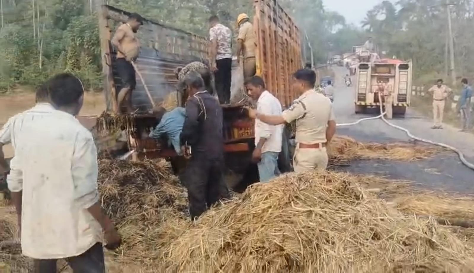 ಹುಲ್ಲಿನ ಹೊರೆ ಲೋಡ್ ತುಂಬಿಕೊಂಡು ಸಾಗುತ್ತಿದ್ದ ಲಾರಿ, ರಸ್ತೆಯ ಮೇಲಿನಿಂದ ಹಾದುಹೋಗಿದ್ದ ವಿದ್ಯುತ್ ತಂತಿಗೆ ತಾಗಿದ ಪರಿಣಾಮ ಏಕಾಏಕಿ ಬೆಂಕಿ ಕಾಣಿಸಿಕೊಂಡಿತು. ಲಾರಿಯಿಂದ ಹೊಗೆ ಮತ್ತು ಬೆಂಕಿ ಕಾಣುತ್ತಿದ್ದಂತೆಯೇ ಸ್ಥಳೀಯರು ತಕ್ಷಣವೇ ಅಗ್ನಿಶಾಮಕ ದಳಕ್ಕೆ ಮಾಹಿತಿ ನೀಡಿದರು.