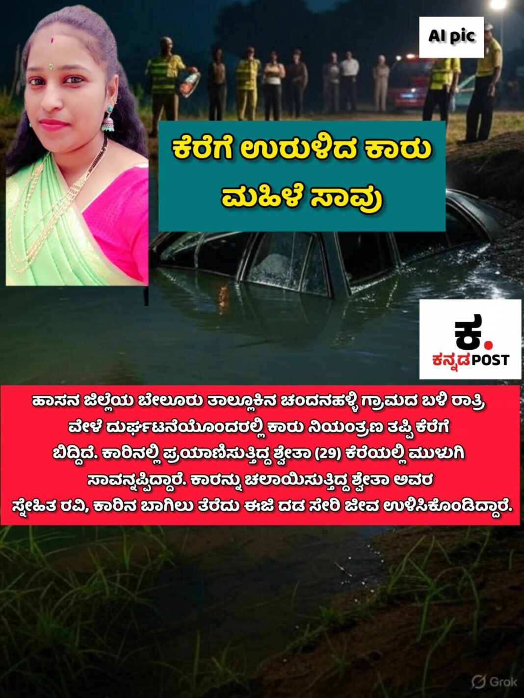 ಕಾರಿನಲ್ಲಿ ಪ್ರಯಾಣಿಸುತ್ತಿದ್ದ ಶ್ವೇತಾ (29) ಕೆರೆಯಲ್ಲಿ ಮುಳುಗಿ ಸಾವನ್ನಪ್ಪಿದ್ದಾರೆ. ಕಾರನ್ನು ಚಲಾಯಿಸುತ್ತಿದ್ದ ಶ್ವೇತಾಳ ಸ್ನೇಹಿತ ರವಿ, ಕಾರಿನ ಬಾಗಿಲು ತೆರೆದು ಈಜಿ ದಡ ಸೇರಿ ಜೀವ ಉಳಿಸಿಕೊಂಡಿದ್ದಾರೆ.
