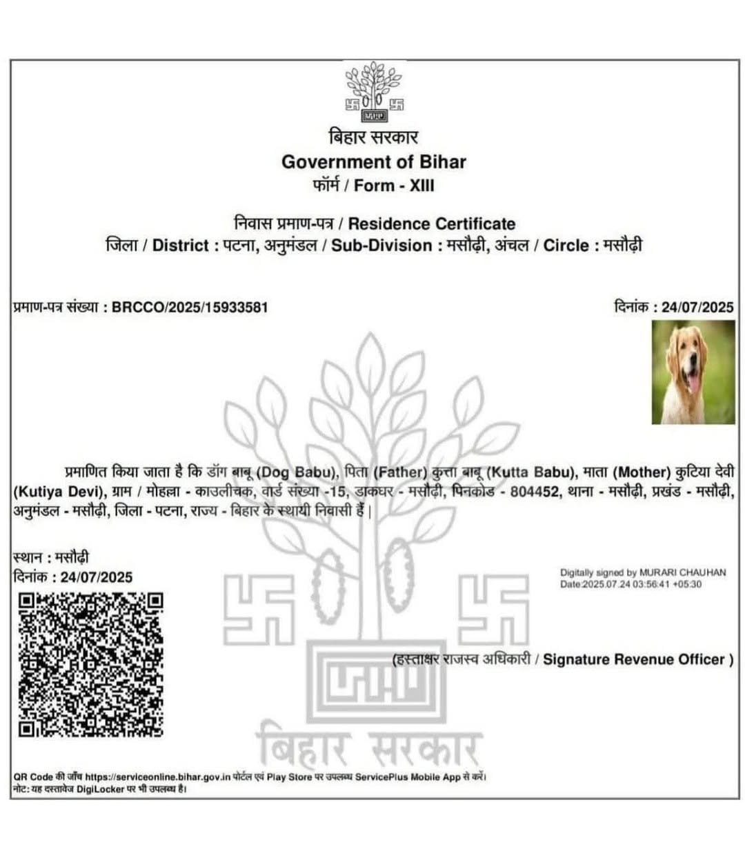 ಪಾಟ್ನಾ: ನಾಯಿಯ ಹೆಸರು ಡಾಗ್ ಬಾಬು, ತಂದೆಯ ಹೆಸರು ಕುಟ್ಟ ಬಾಬು, ತಾಯಿಯ ಹೆಸರು ಕುತಿಯಾ ದೇವಿ ಹೆಸರುಗಳನ್ನೊಳಗೊಂಡು‌ ಬಿಹಾರ ಸರ್ಕಾರದ ಅಧಿಕೃತ ವಾಸ ದೃಢೀಕರಣ ಪ್ರಮಾಣ ಪತ್ರವೇ ಇಶ್ಯೂ ಆಗಿದೆ.