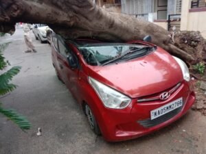 ಹಾಸನ: ಮಳೆ-ಗಾಳಿಗೆ ಬೃಹತ್ ಗಾತ್ರದ ಮರ ಮನೆಯ ಮುಂದೆ ನಿಲ್ಲಿಸಿದ್ದ ಕಾರಿನ ಮೇಲೆ ಬಿದ್ದು ಕಾರು ಸಂಪೂರ್ಣ ಜಖಂಗೊಂಡ ಘಟನೆ ನಗರದ ಕುವೆಂಪುನಗರದಲ್ಲಿ ನಡೆದಿದೆ.