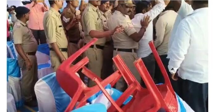 major drama took place during the foundation stone laying ceremony for the railway flyover in Hitnal village of Koppal taluk on Monday, with Congress workers throwing chairs at Union Minister V. Somanna to express their anger.