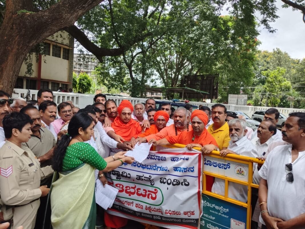 ಹಾಸನ: ಚಿತ್ರನಟ ದರ್ಶನ್ ಆರೋಪಿಯಾಗಿರುವ ರೇಣುಕಾಸ್ವಾಮಿ ಹತ್ಯೆ ಖಂಡಿಸಿ ಹಾಸನದಲ್ಲಿ ವೀರಶೈವ ಲಿಂಗಾಯತ ಸಮಾಜದ ಸದಸ್ಯರು ವಿವಿಧ ಸಂಘಟನೆಗಳ ಸಂಯುಕ್ತಾಶ್ರಯದಲ್ಲಿ ಪ್ರತಿಭಟನೆ ನಡೆಸಿದರು.
