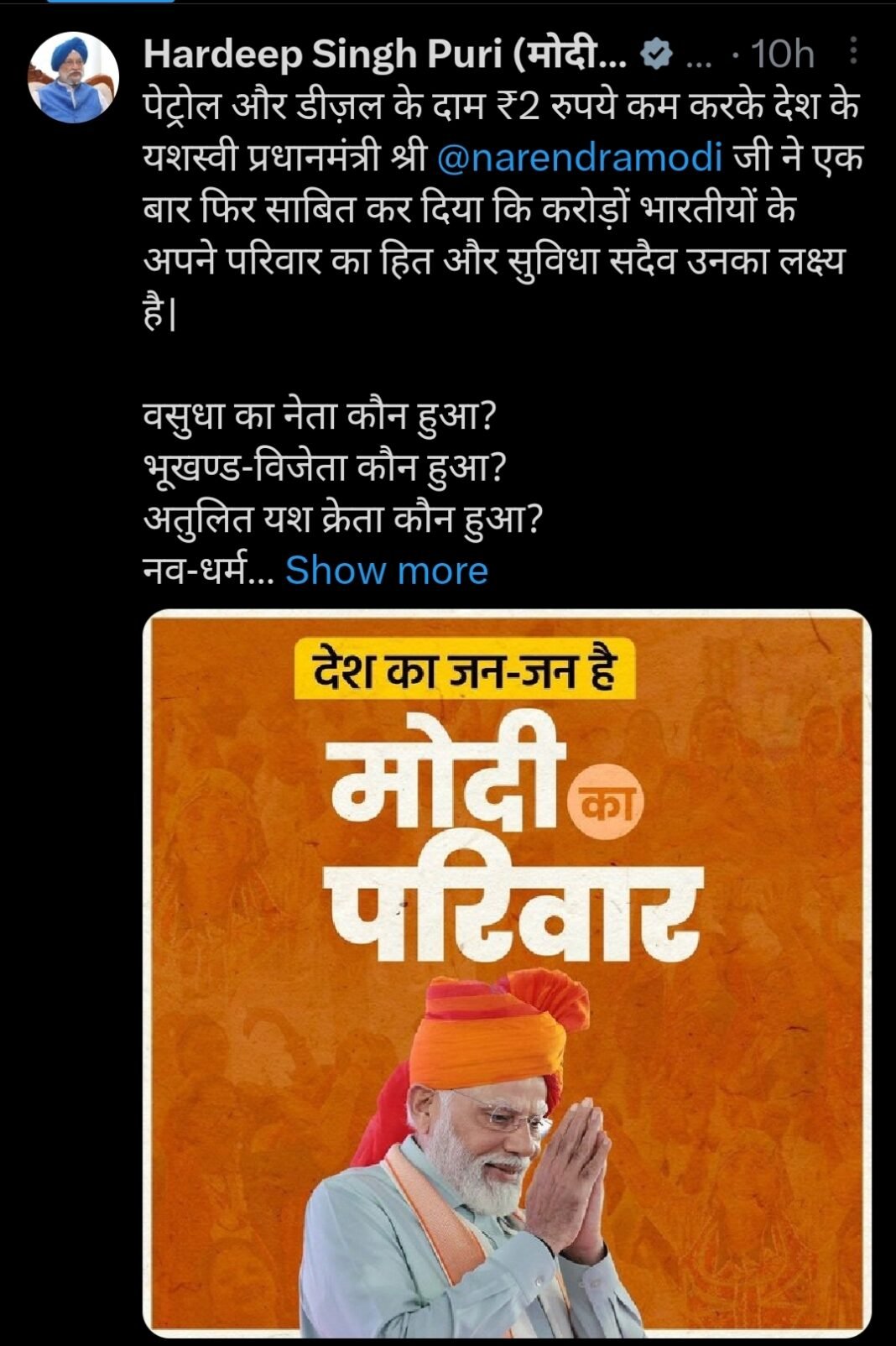 “ಪೆಟ್ರೋಲ್ ಮತ್ತು ಡೀಸೆಲ್ ಬೆಲೆಗಳಲ್ಲಿನ ಕಡಿತವು ಗ್ರಾಹಕರ ವೆಚ್ಚವನ್ನು ಹೆಚ್ಚಿಸುತ್ತದೆ ಮತ್ತು ಡೀಸೆಲ್, ಆರು ಕೋಟಿ ಕಾರುಗಳು ಮತ್ತು 27 ಕೋಟಿ ದ್ವಿಚಕ್ರ ವಾಹನಗಳಲ್ಲಿ ಚಲಿಸುವ 58 ಲಕ್ಷಕ್ಕೂ ಹೆಚ್ಚು ಭಾರೀ ಸರಕುಗಳ ವಾಹನಗಳ ನಿರ್ವಹಣಾ ವೆಚ್ಚವನ್ನು ಕಡಿಮೆ ಮಾಡುತ್ತದೆ” ಎಂದು ಶ್ರೀ ಪುರಿ ಎಕ್ಸ್ನಲ್ಲಿ ಪೋಸ್ಟ್ ಮಾಡಿದ್ದಾರೆ.