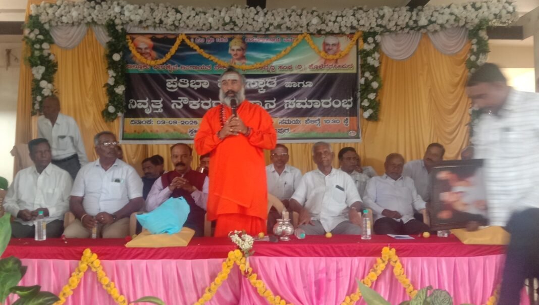ಪಟ್ಟಣದ ಭಸವ ಭವನದಲ್ಲಿ ವೀರಶೈವ ಲಿಂಗಾಯಿತ ನೌಕರರ ಸಂಘ, ನಡೆಸಿದ ಪ್ರತಿಭಾ ಪುರಸ್ಕಾರ ಕಾರ್ಯಕ್ರಮದಲ್ಲಿ ದಿವ್ಯ ಸಾನಿಧ್ಯವಹಿಸಿ ಮಾತನಾಡಿದ ಅವರು, ನಿಷ್ಟೆಯಿಂದ ಕಾಯಕ ನಡೆಸುವ ಮೂಲಕ ಸಮಾಜದಲ್ಲಿ ಶ್ರೇಷ್ಟತೆಯನ್ನು ಕಂಡುಕೊಳ್ಳುವ ಮಾರ್ಗ, ಲಿಂಗಾಯಿತ ವಚನದೊಂದಿಗೆ ದರ್ಶನ ಮಾಡಿಸಿದ್ದಾರೆ. ಬಸವೇಶ್ವರರು ಸಮಾನತೆಯನ್ನು ಜಗತ್ತಿಗೆ ಸಾರಿದವರು. ಧರ್ಮಗುರು ಪರಂಪರೆಯಲ್ಲಿ ದೀಕ್ಷೆ ನೀಡಿ ಸಾಕ್ಷಾತ್ಕಾರದ ಮಾರ್ಗದರ್ಶನ ನೀಡುವೆವು. ಆದರೆ ಶಿಕ್ಷಕರು ಶಿಕ್ಷಣ ನೀಡಿ, ಜ್ಞಾನದ ದೀವಿಗೆ ಬೆಳಗುವರು. ಇದು ಅಂತರAಗ ಮತ್ತು ಬಹಿರಂಗ ಶುದ್ದಿ ಎನ್ನಬಹುದು. ಲಿಂಗಧರಿಸಿ ಆಚಾರವಂತರಾಗಿರುವ ಲಿಂಗಾಯಿತ ಧರ್ಮ ದೇಹತ್ಯಾಗ ಮಾಡಿದಾಗಲೂ ಲಿಂಗೈಕ್ಯ ಎಂದೆನ್ನಲಾಗುವುದು. ಹುಟ್ಟು, ಸಾವುಗಳ ನಡುವೆಯೂ ಲಿಂಗಾರಧನೆ ವೀರಶೈವ ಆರಾಧನೆಯಲ್ಲಿ ಪ್ರಧಾನ ಎಂದರು.