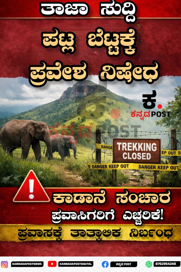 ಪಟ್ಲಬೆಟ್ಟ ಪ್ರದೇಶದಲ್ಲಿ ಕಳೆದ ನಾಲ್ಕು ದಿನಗಳಿಂದ ಸುಮಾರು 10 ಕಾಡಾನೆಗಳ ಗುಂಪು ಬೀಡುಬಿಟ್ಟಿರುವ ಹಿನ್ನೆಲೆಯಲ್ಲಿ, ಸಾರ್ವಜನಿಕರ ಸುರಕ್ಷತೆಯನ್ನು ಗಮನದಲ್ಲಿಟ್ಟುಕೊಂಡು ಅರಣ್ಯ ಇಲಾಖೆ ಈ ನಿರ್ಧಾರ ಕೈಗೊಂಡಿದೆ.