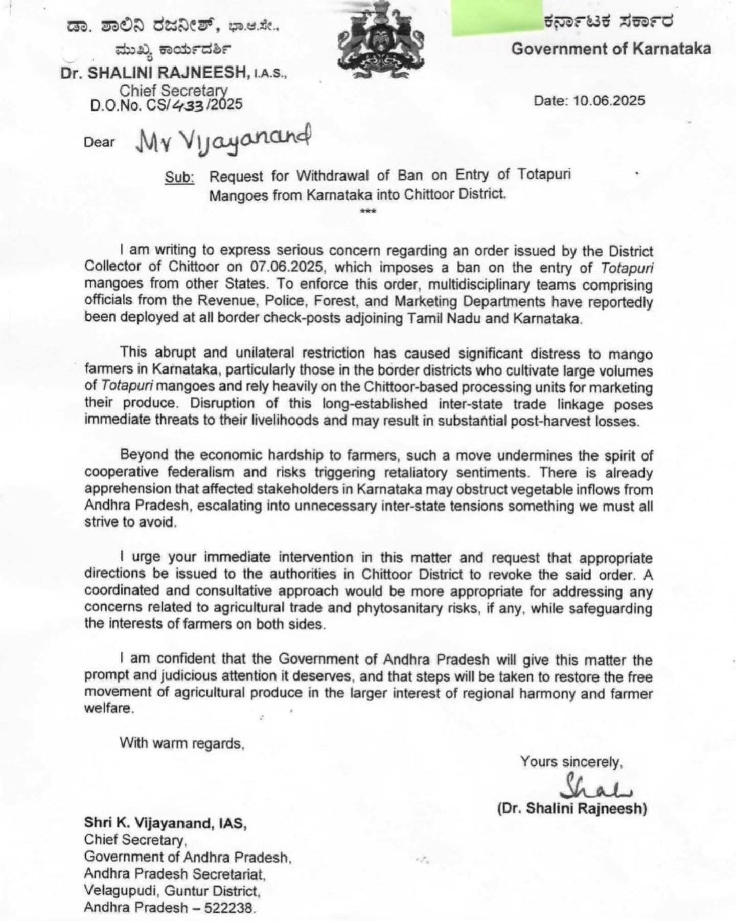 ಡಾ. ಶಾಲಿನಿ ರಜನೀಶ್ ಅವರು ತಮ್ಮ ಪತ್ರದಲ್ಲಿ, ಈ ನಿಷೇಧವು ರೈತರ ಜೀವನೋಪಾಯಕ್ಕೆ ಬೆದರಿಕೆಯನ್ನುಂಟುಮಾಡಿದೆ ಮತ್ತು ಕೊಯ್ಲು ನಂತರದ ಗಣನೀಯ ನಷ್ಟಕ್ಕೆ ಕಾರಣವಾಗಬಹುದು ಎಂದು ಆತಂಕ ವ್ಯಕ್ತಪಡಿಸಿದ್ದಾರೆ. ಇದಲ್ಲದೆ, ಈ ಕ್ರಮವು ಸಹಕಾರಿ ಒಕ್ಕೂಟವಾದದ ಚೈತನ್ಯವನ್ನು ದುರ್ಬಲಗೊಳಿಸುವ ಜೊತೆಗೆ, ಕರ್ನಾಟಕದಲ್ಲಿ ಆಂಧ್ರಪ್ರದೇಶದಿಂದ ತರಕಾರಿಗಳ ಒಳಹರಿವಿಗೆ ತಡೆಯೊಡ್ಡುವ ಪ್ರತೀಕಾರದ ಭಾವನೆಗೆ ಕಾರಣವಾಗಬಹುದು ಎಂದು ಎಚ್ಚರಿಕೆ ನೀಡಿದ್ದಾರೆ.