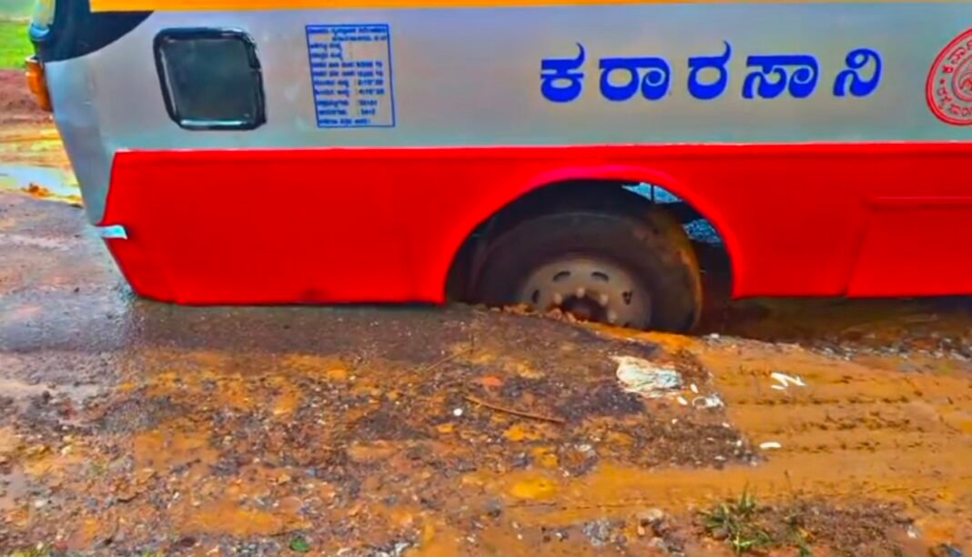 ಮಳೆ ಆರ್ಭಟಕ್ಕೆ ಕುಸಿದ ಡಾಂಬರ್ ರಸ್ತೆ, ಗುಂಡಿಯಲ್ಲಿ ಸಿಲುಕಿದ ಕೆ.ಎಸ್.ಆರ್.ಟಿ.ಸಿ. ಬಸ್