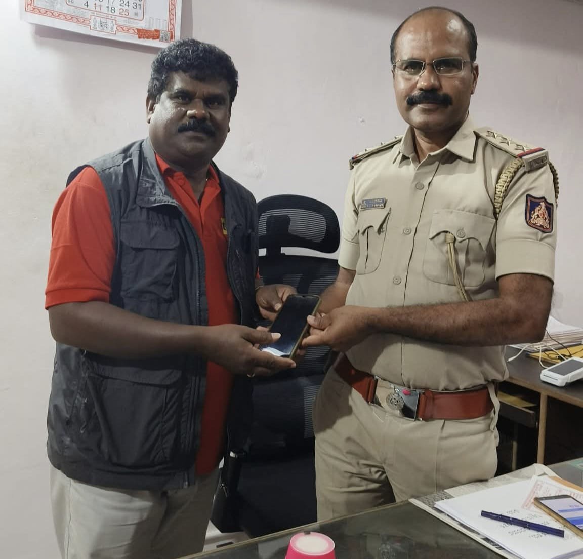 ಕಳೆದ ಒಂದು ತಿಂಗಳ ಹಿಂದೆ ತಾಲೂಕು ಕಾರ್ಯನಿರತ ಪತ್ರಕರ್ತರ ಸಂಘದ ಅಧ್ಯಕ್ಷರಾದ ಜೈಭೀಮ್ ಮಂಜುರವರು ಸುದ್ದಿಗೋಷ್ಠಿವೊಂದನ್ನು ನಡೆಸುವಾಗ ಅವರ ಮೊಬೈಲ್ ನ್ನು ಕಿಡಿಗೇಡಿಗಳು ಕಳವು ಮಾಡಿದ್ದರು. ಜೈಭೀಮ್ ಮಂಜುರವರಿಂದ ಮೊಬೈಲ್ ನ ಬಿಲ್, ಇ.ಎಮ್.ಇ ಸಂಖ್ಯೆಗಳನ್ನು ಪಡೆದ ನಗರ ಠಾಣೆ ಪೋಲಿಸರು ಕಳುವಾದ ಮೊಬೈಲ್ ನ್ನು ಪತ್ತೆ ಹಚ್ಚಿ ಮೊಬೈಲ್ ವಾರಸುದಾರರಿಗೆ ಹಿಂತಿರುಗಿಸಿದ್ದಾರೆ.