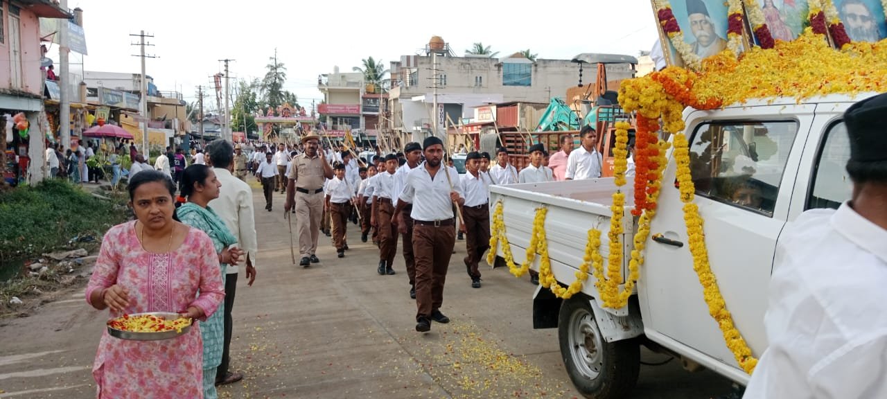 ಸರ್ಕಾರಿ ಪದವಿ ಪೂರ್ವ ಕಾಲೇಜು ಮೈದಾನದಿಂದ ಪಥ ಸಂಚಲನ ಆರಂಭವಾಯಿತು. ಆರ್.ಎಸ್.ಎಸ್ ಗಣವೇಷಧಾರಿಗಳು ಧ್ವಜ ವಂದನೆ ಸಲ್ಲಿಸಿದರು.