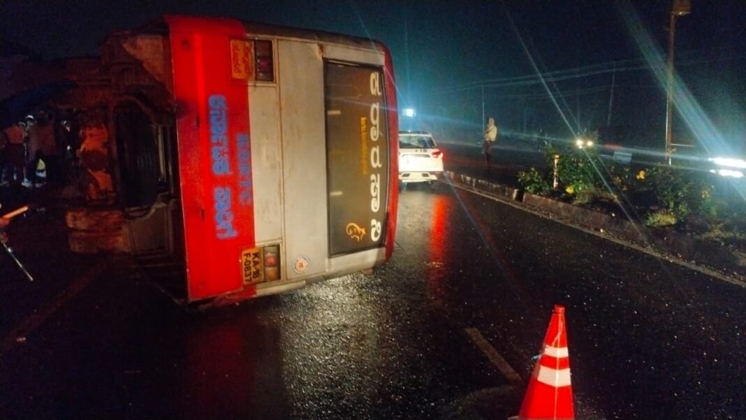 ಕಾರೊಂದನ್ನು ಹಿಂದಿಕ್ಕುವ ಭರದಲ್ಲಿ ಚಾಲಕನ ನಿಯಂತ್ರಣ ತಪ್ಪಿದ ಬಸ್ ರಸ್ತೆಗೆ ಪಲ್ಟಿಯಾಗಿದೆ.