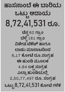 ಹುಂಡಿ ಸೇರಿದಂತೆ ಎಲ್ಲಾ ಮೂಲಗಳಿಂದ ಈ ಬಾರಿ ದೇವಾಲಯಕ್ಕೆ ಬರೋಬ್ಬರಿ ೮.೭೨ ಕೋಟಿ ಆದಾಯ ಹರಿದುಬಂದಿದೆ.