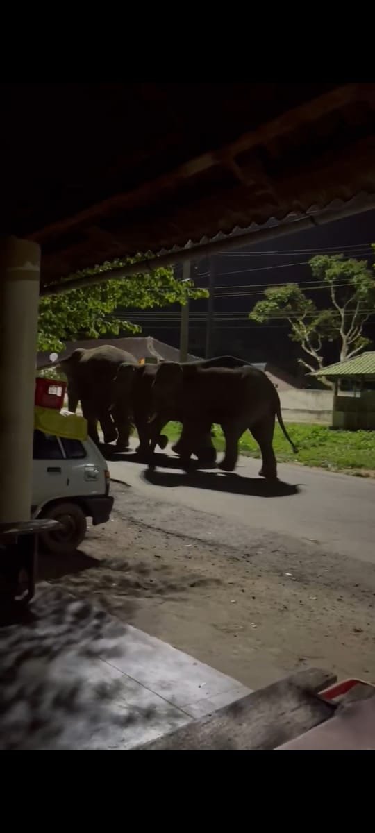 ಗ್ರಾಮದೊಳಗೆ ಆಹಾರ ಅರಸಿ ಓಡಾಡಿದ ಸಲಗಗಳು ರೈತರ ಜಮೀನುಗಳಿಗೆ ನುಗ್ಗಿ ಭತ್ತ, ಕಾಫಿ, ಬಾಳೆ, ಅಡಿಕೆ ಬೆಳೆ ನಾಶಮಾಡಿದವು.